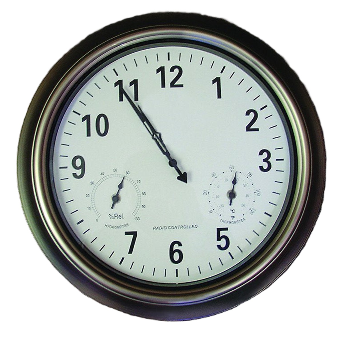 The Har-Tru Tennis Court Clock is an all-weather clock designed to handle the sun, rain, wind and cold. The clock is radio-monitored and updated every few hours from the United States military atomic clock in Boulder, Colorado. This all-weather clock measures 18" in diameter and is designed to handle the sun, rain, wind and cold. Also provides temperature and relative humidity.