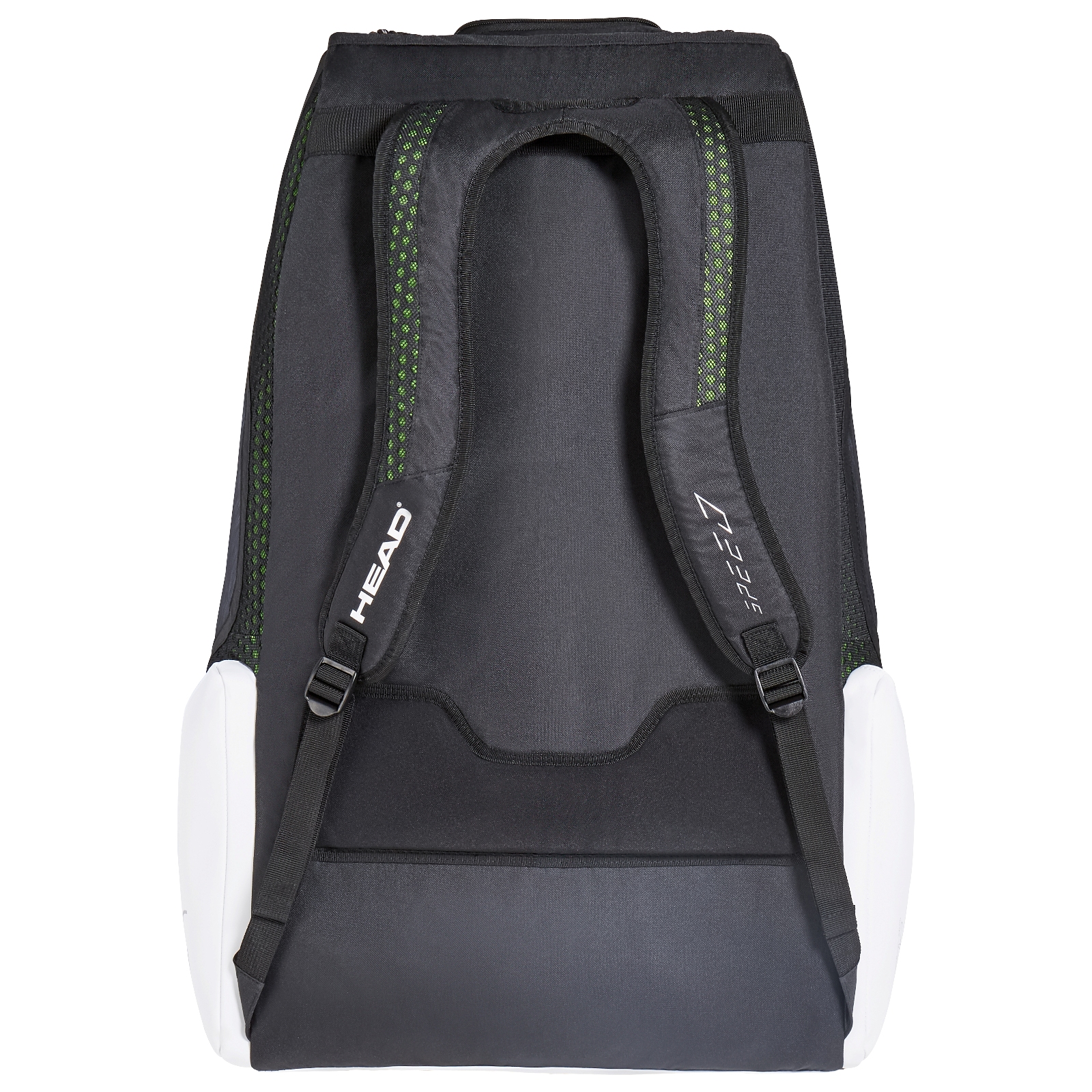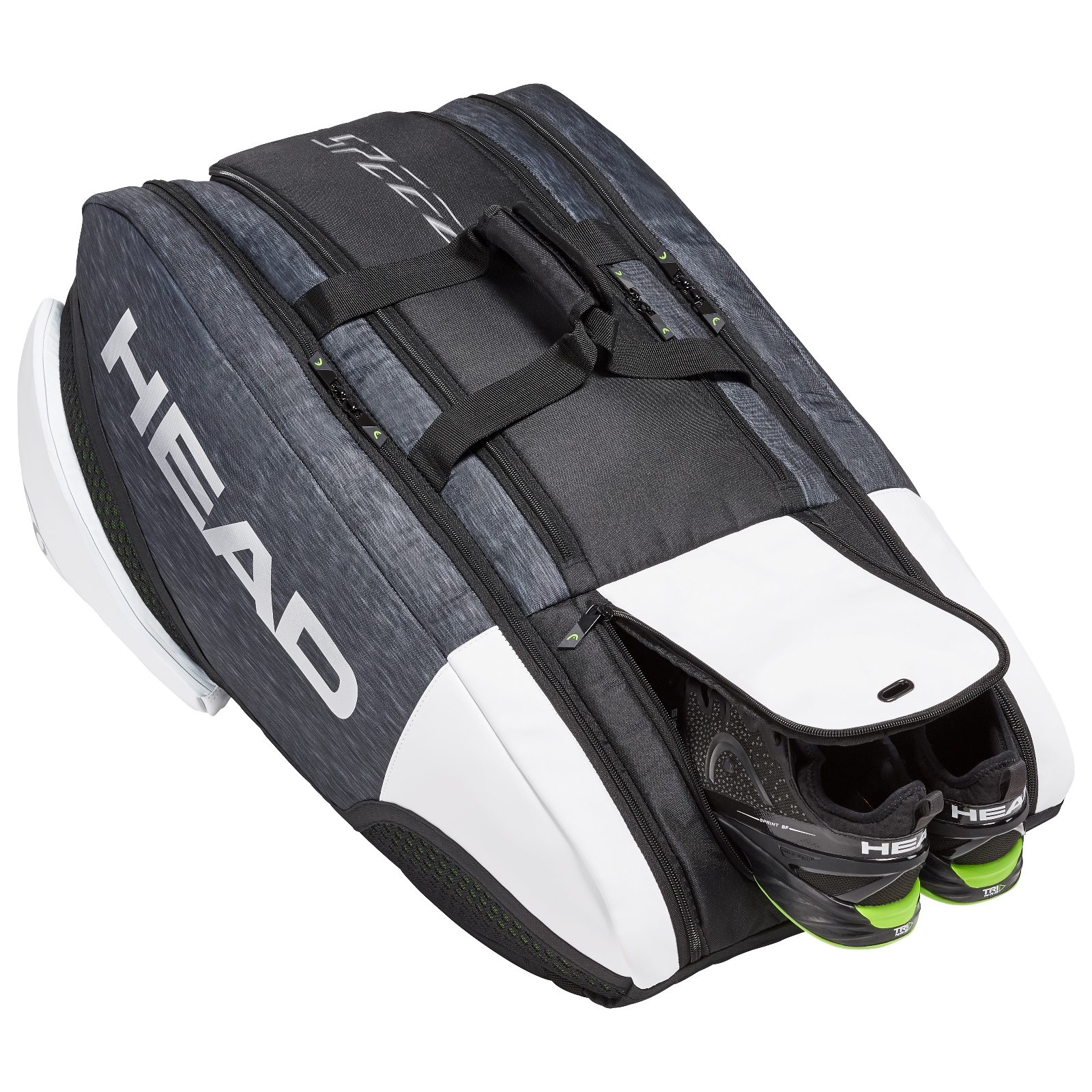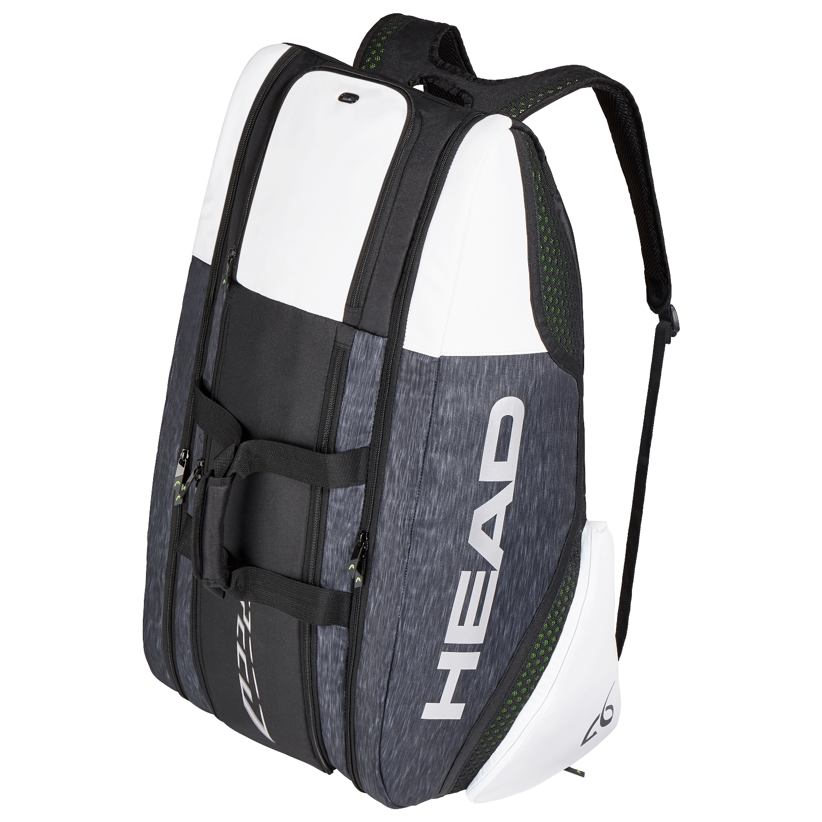 This elegant and high-quality Head Djokovic 12R Monstercombi tennis bag combines style and all of the room you need into a top-notch premium product. Two main compartments, two outside accessory pockets as well as an integrated shoe compartment will ensure that your packing style is under full control. Made from high-quality materials and inspired by the overall SPEED design story, the bag comes with the latest innovations such as climate control technology CCT+ in one of the main compartments, which protects your equipment from extreme temperatures. With its new distinguished shape of rounded edges and playful green design elements, the bag also features Novak Djokovic's signature and logo. Thanks to the backpack carry system, you can either casually flip this bag over your shoulder or onto your back.