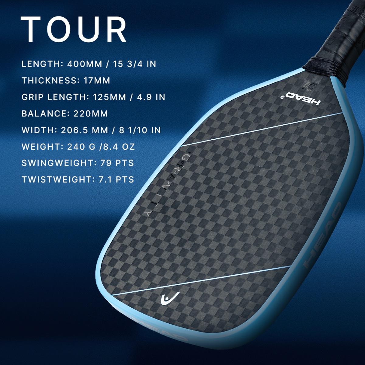 The Head Gravity Tour Pickleball Paddle is Head’s most control-focused paddle, offering a compact sweet-spot shape and a 12k Raw Carbon surface.