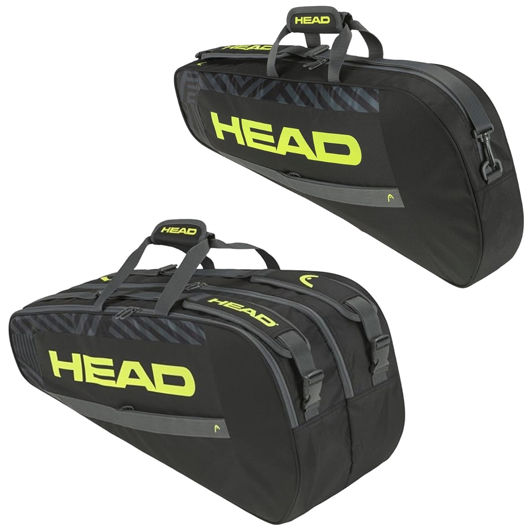 Choose between the Head Base 3R Tennis Bag S or the Head Base 6R Tennis Bag M. Both bags are Black/Neon Yellow in color, are made of 100% Polyester and have an outside zipper pocket for accessories. The 3R has one main compartment with space for up to 3 racquets and measures 30 x 4 x 13 in. The 6R has two main compartments with space for up to 6 racquets, can be carried with a shoulder strap or as a backpack, and measures 30 x 11 x 13 in.