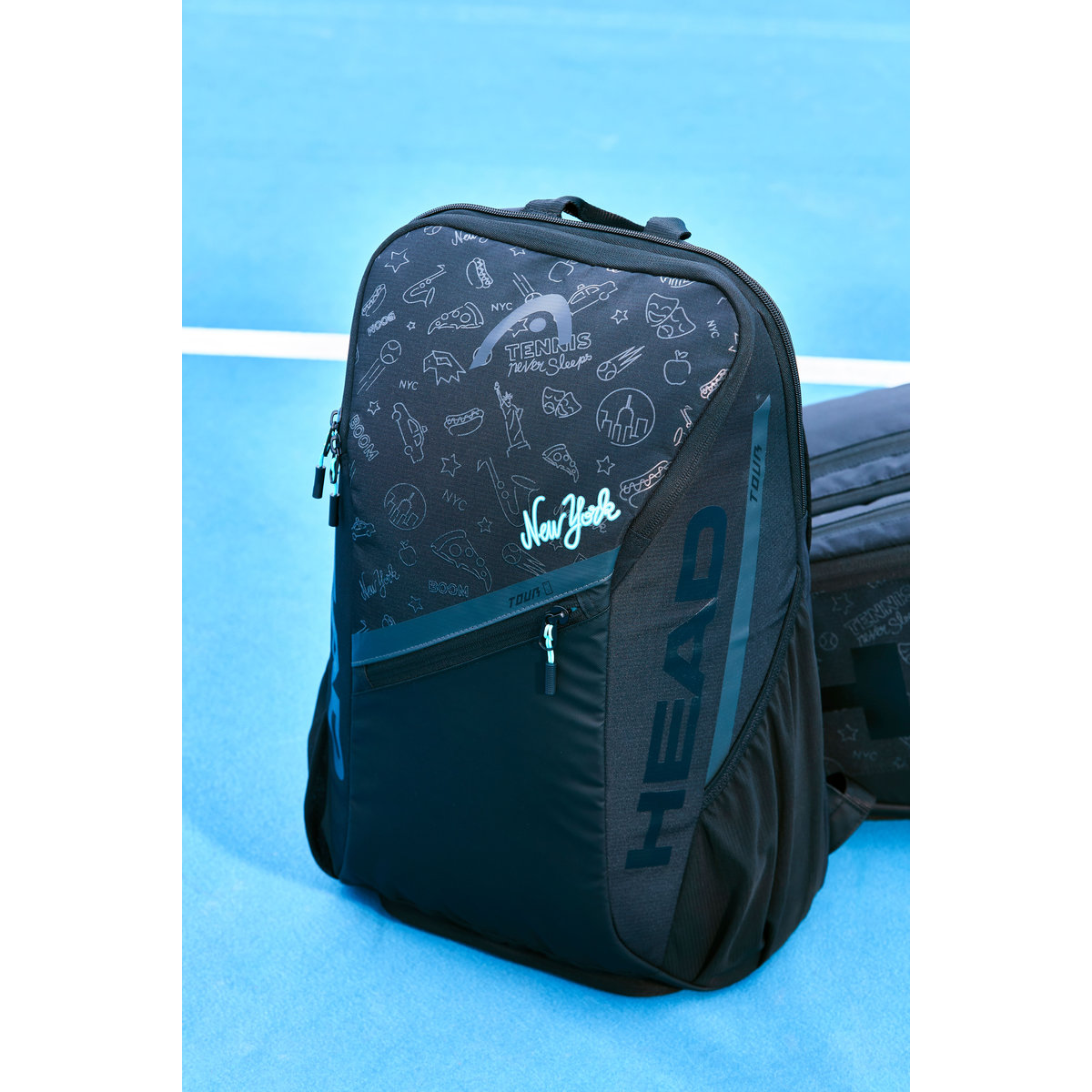 Feel the energy of New York City with the limited-edition Head Tour Tennis Backpack 25L (Neon), which has a fun and fresh design featuring skyscrapers, the Statue of Liberty and a slice of pizza. The black reflective print enhances the pattern and helps you to be seen after dark, while the black glossy tonal print logos also add to the modern look. Inside, the light blue lining is detailed with the same pattern that is on the outside. This bag is perfect for carrying the limited-edition Neon Boom racquets.
