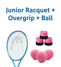 The Junior Tennis Racquet + Overgrip + Ball Bundles include a entry level junior tennis racquet, three grips and three tennis balls. Racquets can be purchased in several lengths and there are some bundles with pink tennis balls.