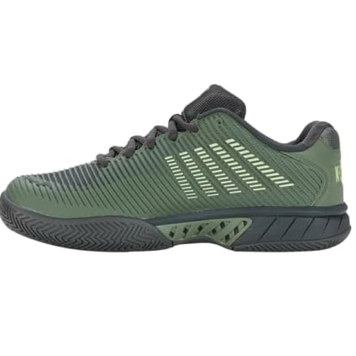 The K-Swiss Men’s Hypercourt Express 2 2E Wide Tennis Shoes (Sea Spray/Urban Chic/Soft Neon Green) is light, comfortable, breathable and has a generous fit, making it the ideal choice for a variety of playing styles and levels. Durawrap Flex, gives the shoe support with no break-in period, while Surgelite midsole technology provides all day comfort.