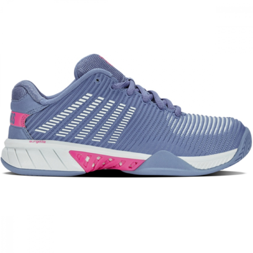 The K-Swiss Women’s Hypercourt Express 2 HB Tennis Shoe (Infinity/Blue Blush/Carmine Rose), K-Swiss’ best-selling shoe, has been made even better by adding Surgelite midsole technology. The K-Swiss Women’s Hypercourt Express 2 HB Tennis Shoe is now even lighter and more comfortable while keeping its trademark breathability and generous fit. Additionally, the brand introduces Durawrap Flex, giving the shoe more support with no break-in period. The new upper design instantly makes the model fresh and modern looking which will impress current and new tennis players who wear the shoe.