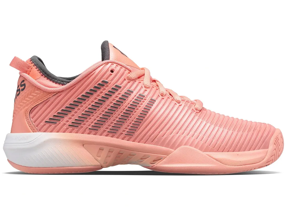 The K-Swiss Women’s Hypercourt Supreme Tennis Shoe (Peach Amber/White/Asphalt) targets a competitive junior or competitive adult player who is looking for a light and responsive shoe to get them to the ball faster. Worn by ATP and WTA professional athletes, the Hypercourt Supreme incorporates Surge 7.0 for maximum energy return and Dragguard 7.0, elevating outsole durability.