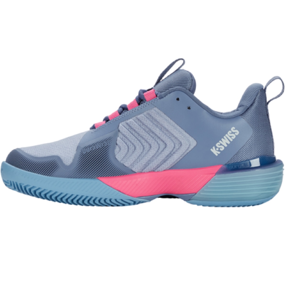 The K-Swiss Women’s Ultrashot 3 HB Tennis Shoes (Infinity/Blue Blizzard/Heritage Blue)is built for competitive, aggressive, and powerful tennis players who demand a shoe with the highest level of performance. Worn by ATP and WTA professional athletes, the Ultrashot 3 offers maximum energy return with Surge 7.0 midsole technology, 360 Plantar Chassis Support for unlimited lateral movement, and Dragguard 7.0 incorporated into a new durable outsole with superior grip and traction.