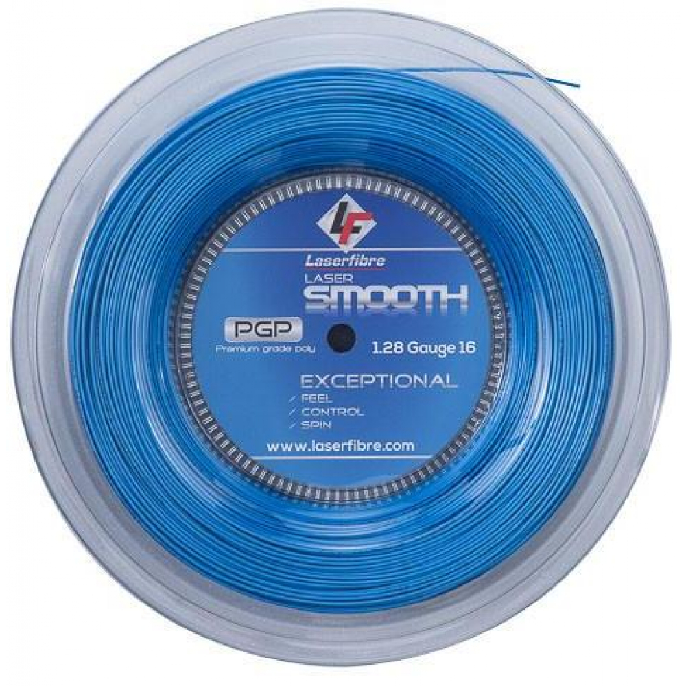 Laserfibre Laser Smooth 16g blue tennis racquet string is made from the ultimate co-poly formula for laser accuracy and exceptional feel. Firm blend Premium Grade Poly construction for outstanding durability and snap-back.