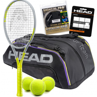 This is the Matteo Berrettini Head Extreme MP racquet setup combined with the Head Extreme Pro Large tennis duffle bag that he uses. The racquet comes strung with Barrettini’s string setup with a full bed of Signum Pro Firestorm 125 at 53 lbs. This Matteo Berrettini package also comes with a 3 pack of Head Prime Pro Overgrip and a can of tennis balls.