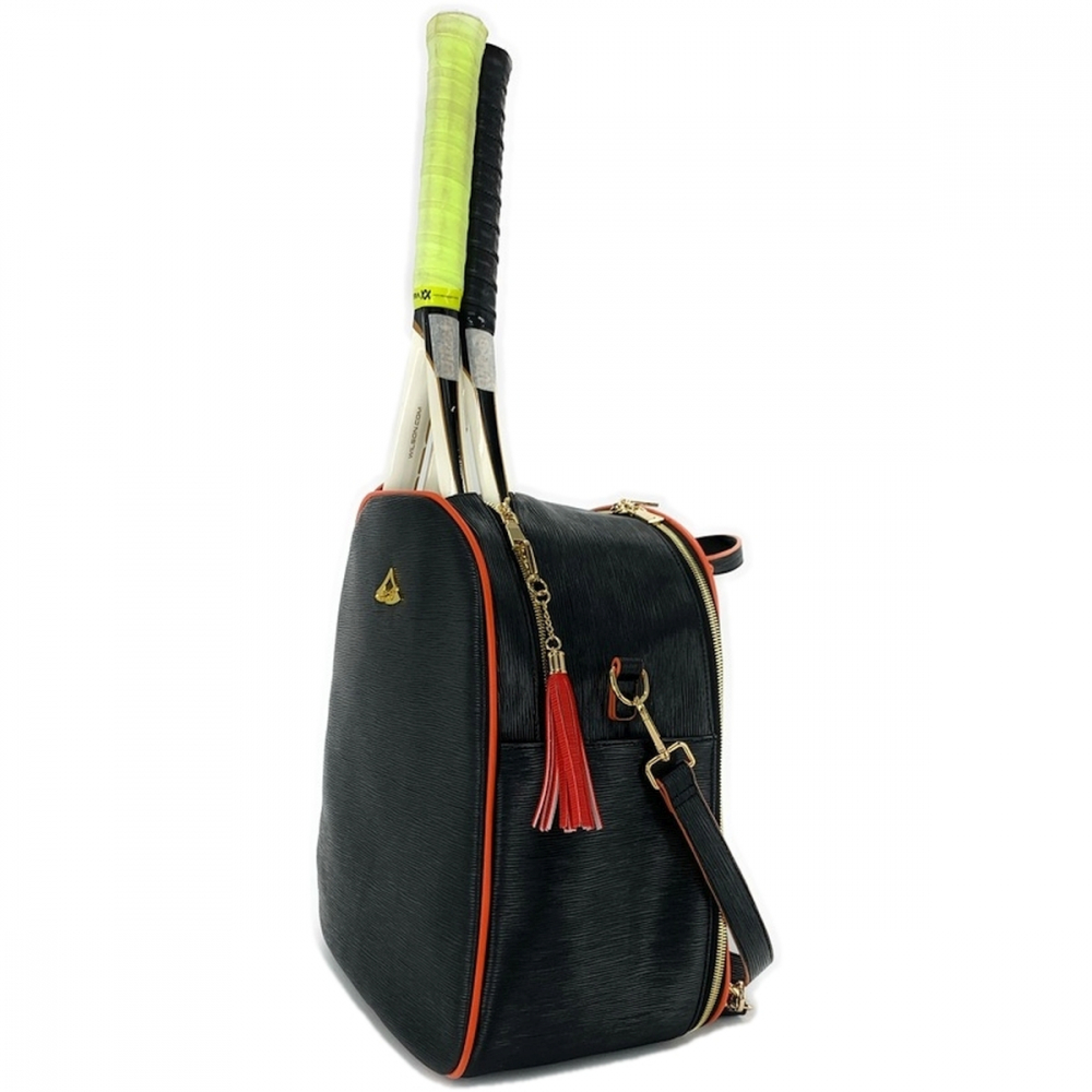 The NiceAces Women’s HANA 2-Racquet Tennis Backpacks are handmade using a water ripple pattern in the highest quality Vegan Leather. The unique design of this tennis backpack is multi-functional and can accommodate two tennis racquets, pickleball paddles, or padel rackets with four inside pockets and side pockets. The adjustable backpack straps and padded shoulder strap provide comfort while you carry all of your tennis gear. The tennis bag features gold metal hardware with durable corn tooth zippers. Scratch protection is provided for the bottom with large gold buttons, decorated with a matching color tassel. Includes a key holder and two bottle or can holders, plus a beautiful matching clutch.