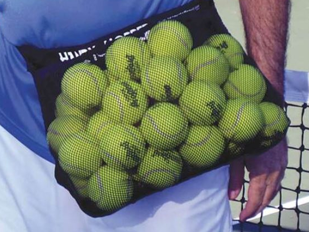 The improved OnCourt OffCourt Handy Hopper Ball Bag now holds up to 36 balls! Great for travelling coaches. No more cardboard boxes at tournaments! Comfortable to wear around the waist. Expandable pouch holds up to 36 tennis balls.