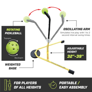 This solo pickleball trainer is nearly identical to the tennis version but has a lighter hitting arm, uses a spinning pickleball (to help players learn how to feel and hit spin more effectively), and a lower hitting height, making it suitable for the sport of pickleball.