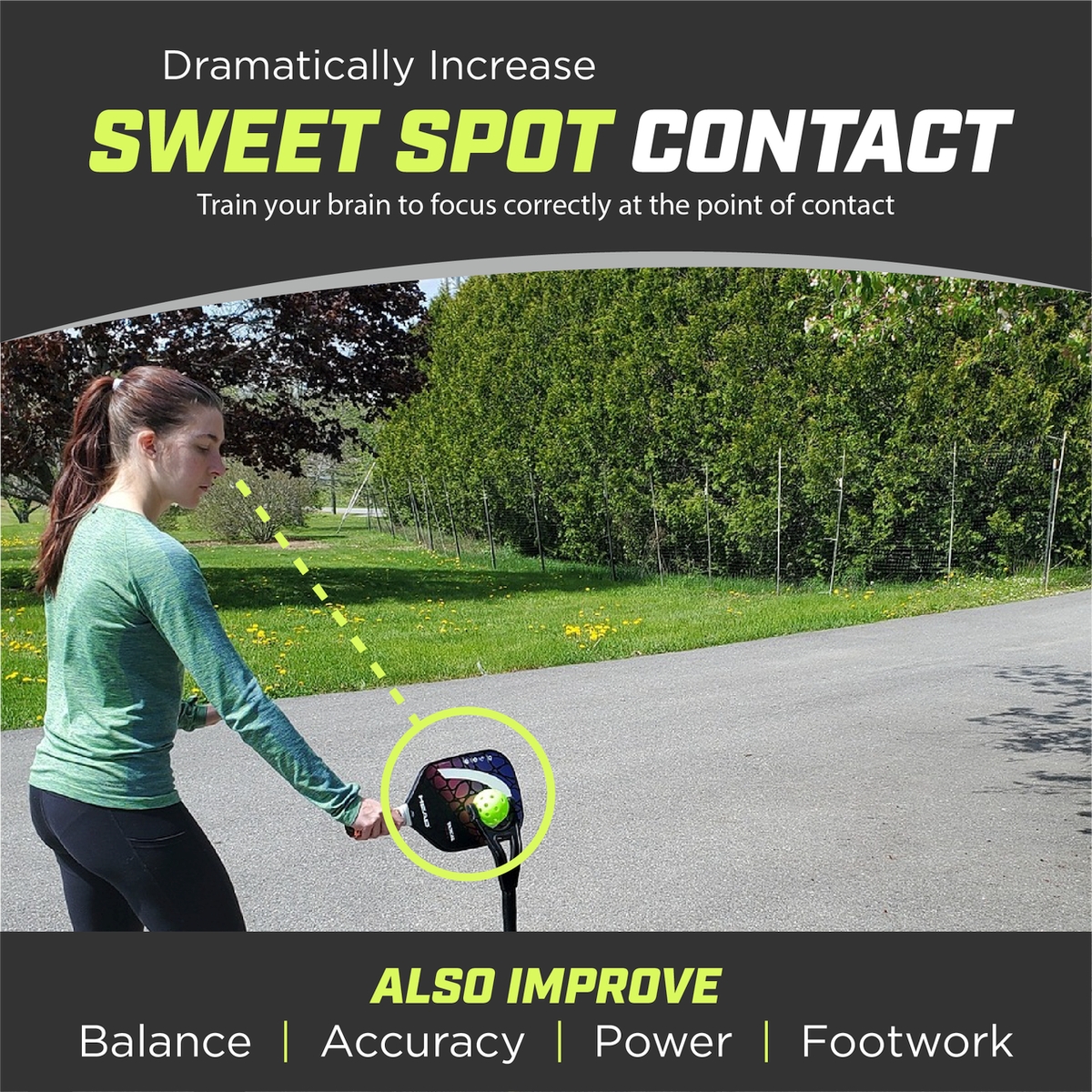 Sure, this instruction makes sense but unfortunately, recreational pickleball and tennis players hit off center the majority of the time! And, we all know that hitting in the center of percussion or “sweet spot” produces the most accurate and powerful shots!