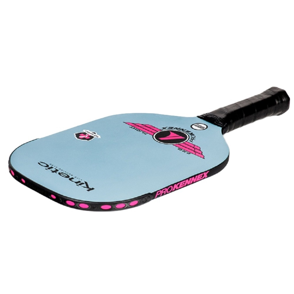 The Pro Kennex Pro Flight Pickleball Paddle (Pink) is engineered for maneuverability with wind resistant edgeless construction and thin core technology. This pickleball paddle is lightning in your hand. Built for quickness and reflex enhancement, the paddle boasts unparalleled tip speed. With the Kinetic shock absorbing system, touch, feel, and kitchen play are all enhanced bringing the best of both worlds. The New Flight Series is the lightest paddle Pro Kennex offers and results in lightning fast reflexes and superb maneuverability.