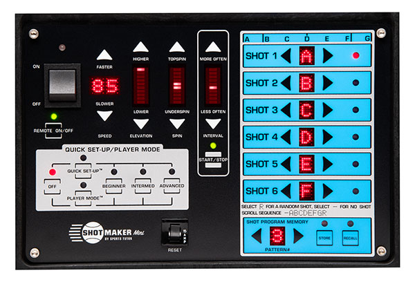 Shot Program Memory – Can be programmed to shoot balls in a pattern of up to six shots, with each shot directed to any of seven different court positions, or to a random position. Up to eight shot sequences can be stored, and then recalled any time with the touch of a button.