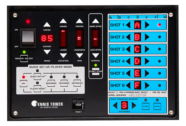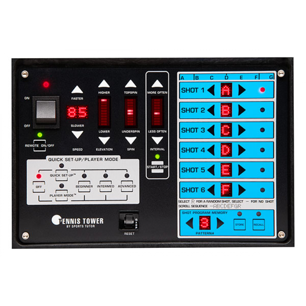 Shot Program Memory – Can be programmed to shoot balls in a pattern of up to six shots, with each shot directed to any of seven different court positions, or to a random position. Up to eight shot sequences can be stored, and then recalled any time with the touch of a button.