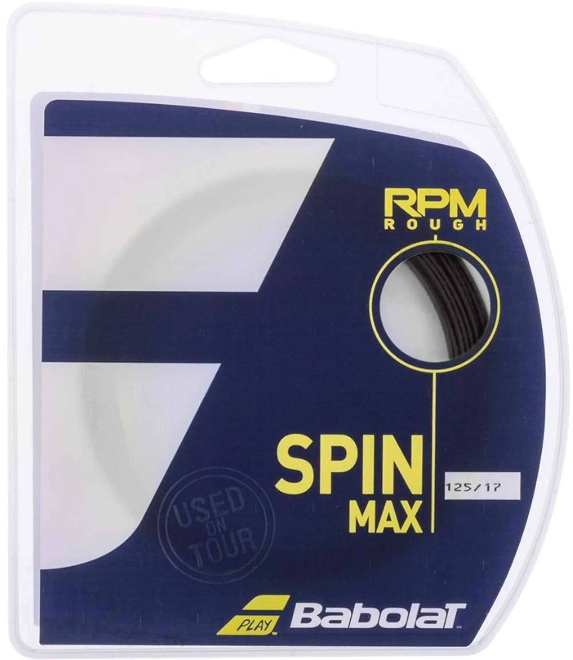 The Babolat RPM Rough Spin Max 17g Tennis String (Set) is a rougher version of the best selling RPM Blast, which will provide increased spin potential. The Babolat RPM Rough 17g features an octagonal section with a rough texture, and cross-linked silicone - producing a unique sensation thanks to the high-density Co-PET. This string is an outstanding choice for heavy hitter looking for the ultimate spin experience.