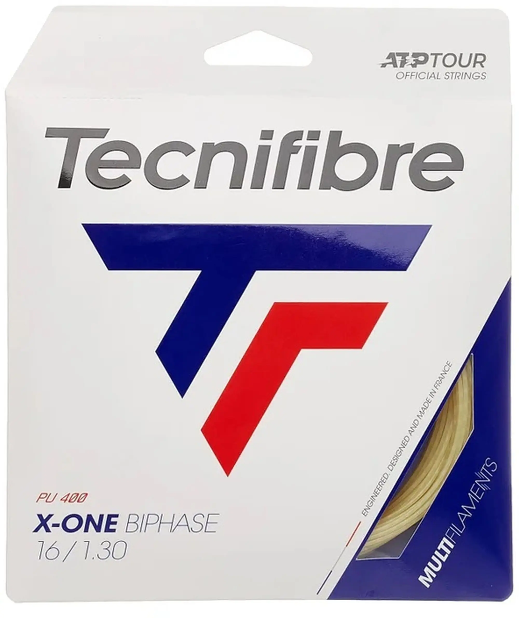 Tecnifibre X-One Biphase String 16g is a premium multifilament string, X-One BiPhase delivers superb comfort, feel and a crisp response. A good choice for players seeking an arm friendly string without sacrificing power. Provides good tension maintenance too. About as gut-like as synthetics get. Offers a livelier feel, but with slightly more durability compared to the 17 gauge version and is a great choice to liven up a tight string pattern.