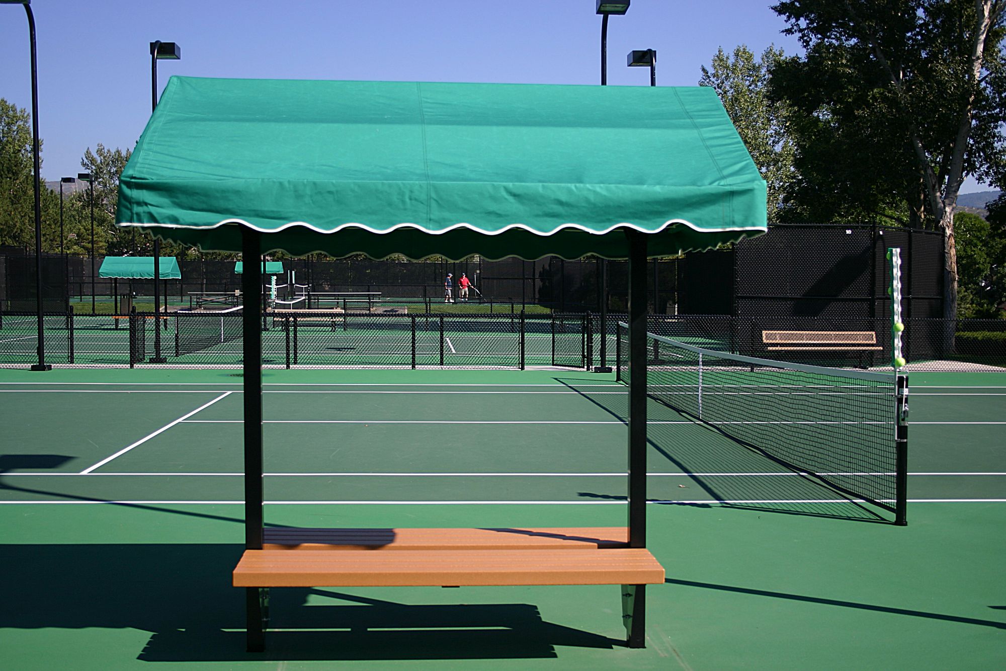 The SunTrends 6 ft Flat Cabana Tennis Court Bench - Direct Burial is perfect for golf tees, tennis courts, poolside, parks, or anywhere people might want a shady spot to sit or quick shelter from sudden rain. Additional bench style options, custom canvas colors, and logo imprints are available at an additional charge. Call for details.