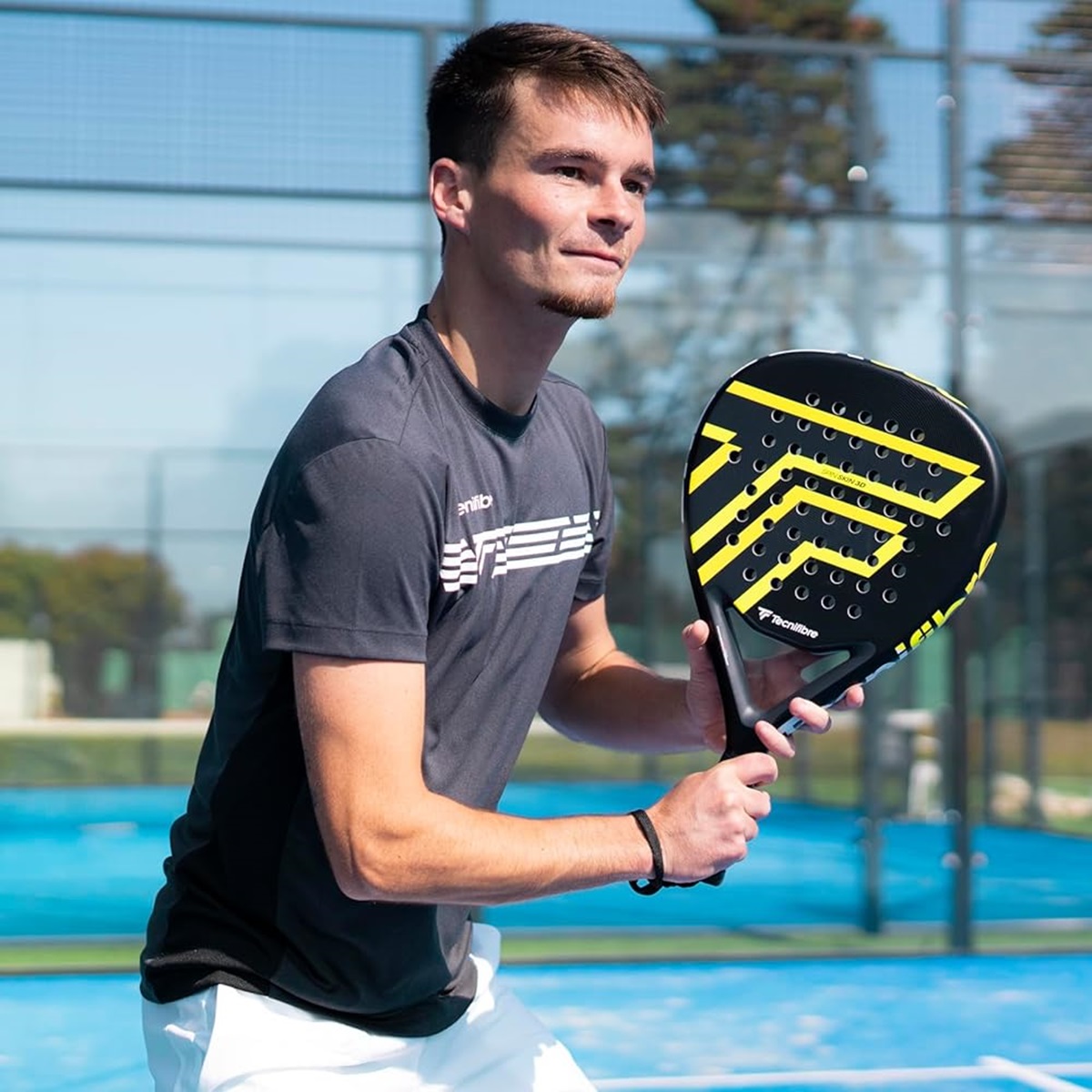 The Tecnifibre Wall Breaker 375 Padel Racket (Black/Yellow) is dedicated to high-level performance players with its teardrop shape that provides maximum power without sacrificing control. This Padel racket has a weight of 375g to optimize handling and a graphite composition for quality play. The geometry of the D-Bridge bridge raises the flex point of the racket to facilitate the finishing of points, especially on attack smashes. The screen is covered with "Spin Skin 3D" relief for maximum spin and the PHD drilling plan with holes of 3 different diameters to maximize center accuracy and tolerance to off-center hits at the ends. The racket head designed with "X-TOP" technology is a mix of aramid fibers, the most resistant, are covered with a PTFE treatment to limit abrasion.