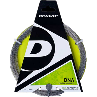Dunlop recently created the “Biomimetic” line of products which are based upon copying nature’s best designs. The DUNLOP DNA string is promoted as providing “power & durability” and is rated on a 10-scale (by Dunlop) as follows: Power – 9, Comfort – 9, Spin – 6, and Durability – 7. They also say that DNA is a premium multi-filament string which uses “Pure DuPont PA66 central core” and has a PBT fiber coil. The fibers are bonded with thermo-elastic PU resin. Basically, it is a multi-filament core with a single coil added and then an outer coating.