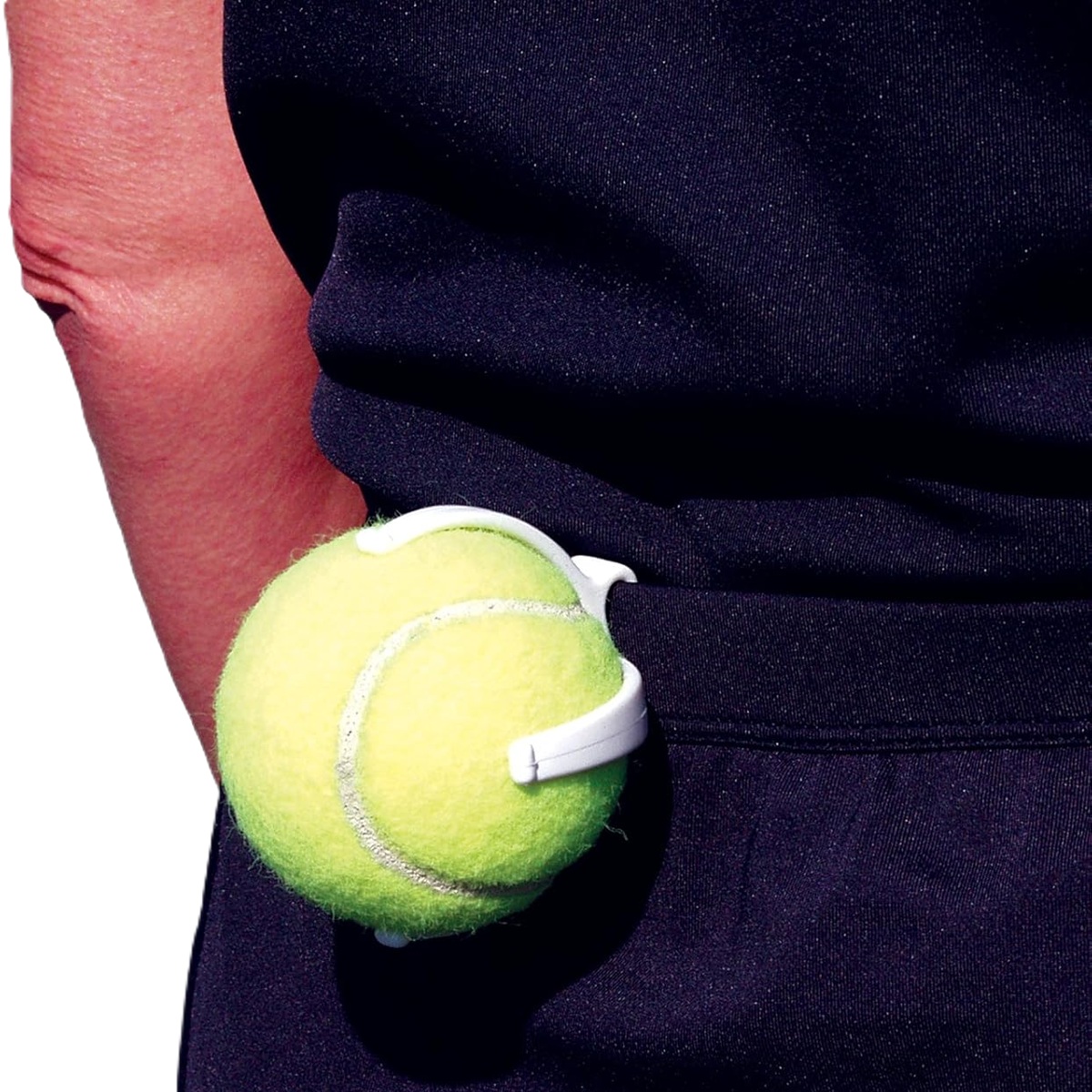 The Tourna Tennis Ball Claw attaches to you waistband to hold one tennis ball while you play. Folds flat when not in use and easily fits in a bag or pocket.