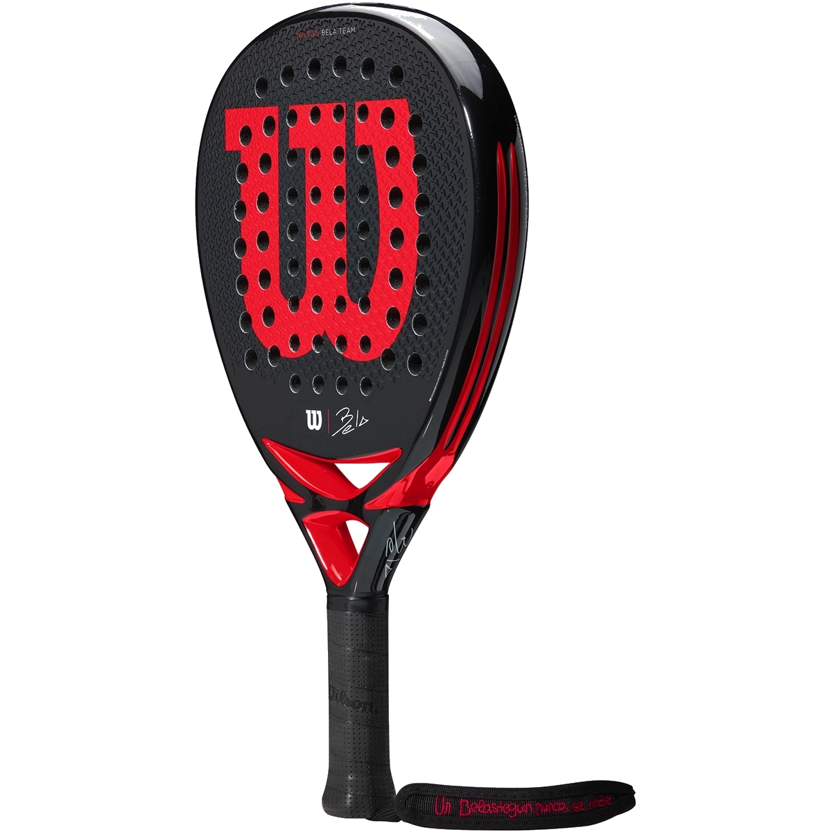 The most playable racket in Wilson’s all-new Fernando Belasteguin collection, the Wilson Bela Team Padel Racket aims to upgrade your game and look the part while doing so. Top features include a woven fiberglass material for extra stability, an arrow pattern surface texture for increased spin and a slick design highlighted by infrared accents and Bela’s signature. An inspirational story of overcoming injury and all odds to become one of the greatest players of all time, Bela seeks to inspire the untapped legend within you. Racket includes wrist cord that features “A Belasteguin Never Gives Up” in his daughter’s Spanish handwriting, a source of inspiration for Bela when he encountered his most challenging obstacles both on and off the court.