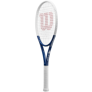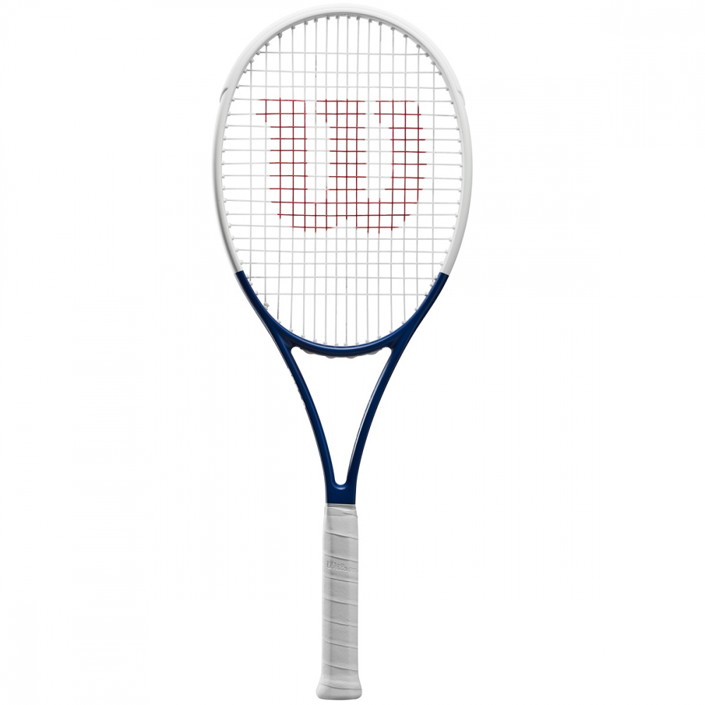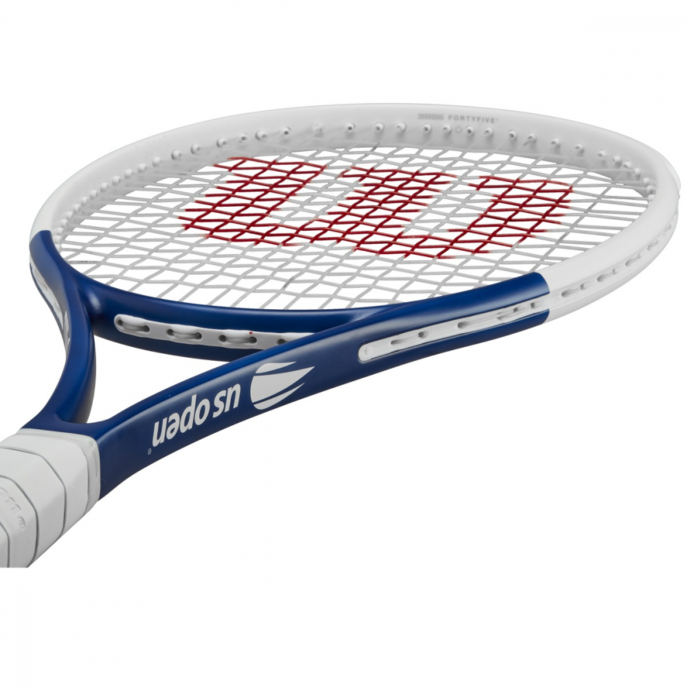 The Wilson Blade 98 v8 16x19 US Open Ltd Tennis Racquet pairs captivating design with a new layup to better accommodate the more modern, vertical swing path commonly used by competitive players. The headliner innovation, FORTYFIVE°, manages to increase both the flexibility and stability of the frame to lend supreme feel for the ball on every shot. Still characterized by its superior presence in the hands of the best players in the world, this evolution of Blade rewards aggressive, precise ball-strikers with a top-tier blend of connected-to-the-ball feel, torsional stability and color-shifting design to wow teammates and opponents alike. This US Open design has a white handle and head with a dark blue throat area. US Open® is on the handle.