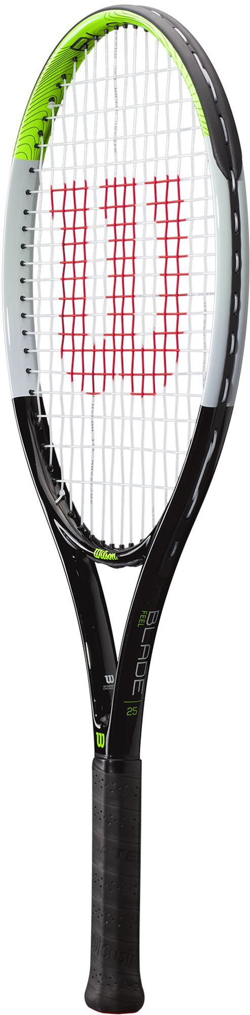 The Wilson Blade Feel 25 Inch Junior Tennis Racquet is inspired by Wilson’s performance Blade line. The Blade Feel 25 appeals to developing juniors through a mix of playability, feel and design. Constructed of both stiff and flexible properties thanks to a fused graphite and aluminum construction, this racket lends commanding feel on every stroke. Complete with a clean and electrifying design, this frame is worth a serious look for any juniors looking to improve their game.