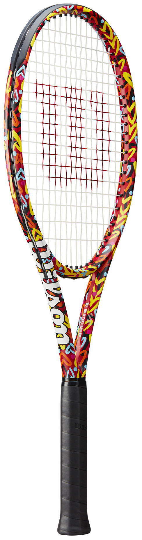 The Wilson Clash 100 v2 Britto Hearts Tennis Racquet features Romero Britto's signature artistic style combined with Wilson's Clash 100 v2 design for a bold look on the court.