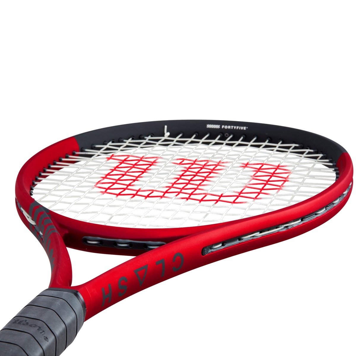 Swing comfortably and swing confidently with the Wilson Clash 100L v2 tennis racquet, a lighter racket with the same enticing benefits that have come to define the Clash franchise. Loaded with bending properties and a unique FORTYFIVE° carbon construction for an unparalleled mix of flexibility and stability, this frame appeals to audiences with a preference for arm-friendly comfort, lightweight power and easy maneuverability. A revised makeup at the tip of the frame increases the sweet spot from
