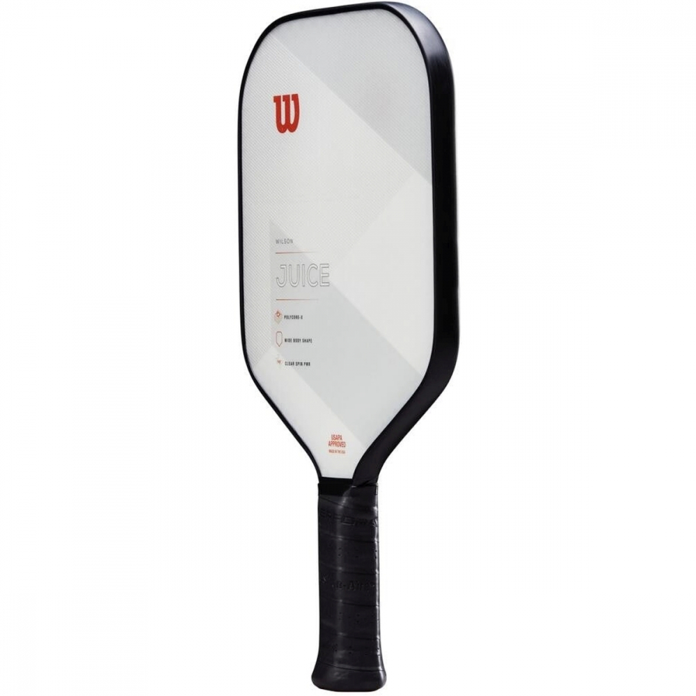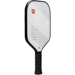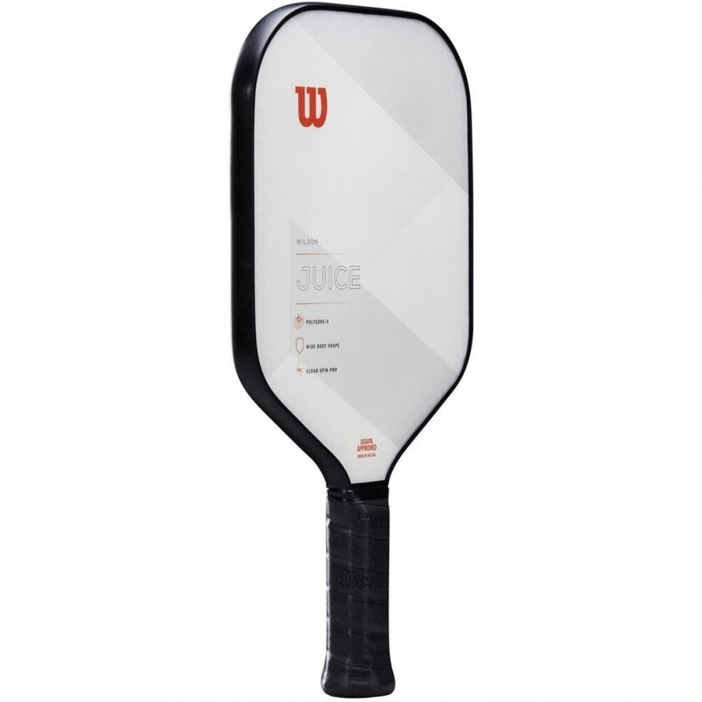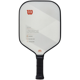 Delivering an appealing combination of clean design and sheer power, The Wilson Juice Pickleball Paddle introduces a new wave of paddle performance to the pickleball court. The Juice features a printed spin tech on the paddle surface that increases ball rotation off the paddle surface, giving players the confidence they need to be aggressive with powerful shots when the situation warrants it. Sporting a wide body shape for a generous sweet spot and a core that impressively dampens vibrations, the USAPA-approved Juice feels great and performs even better.