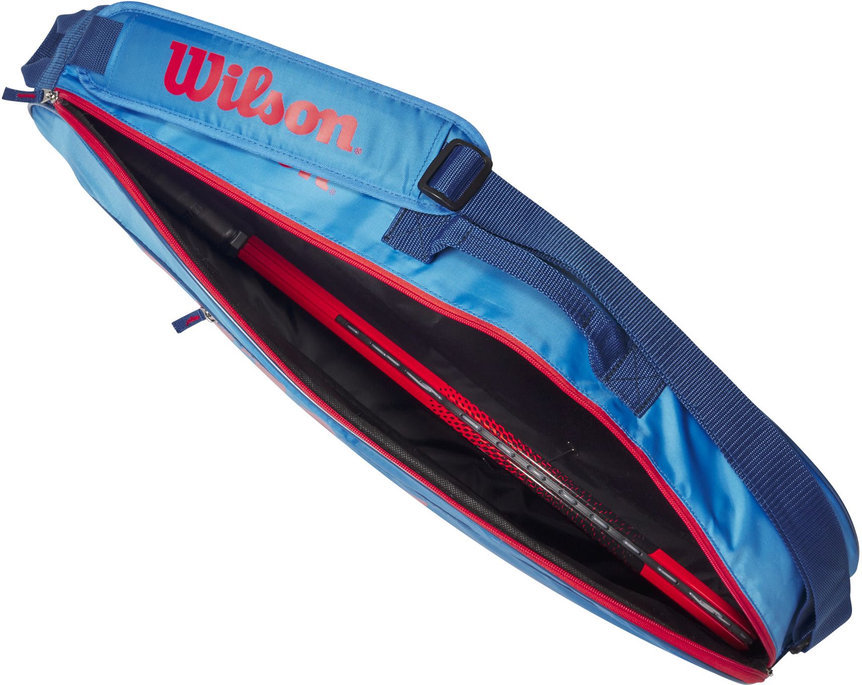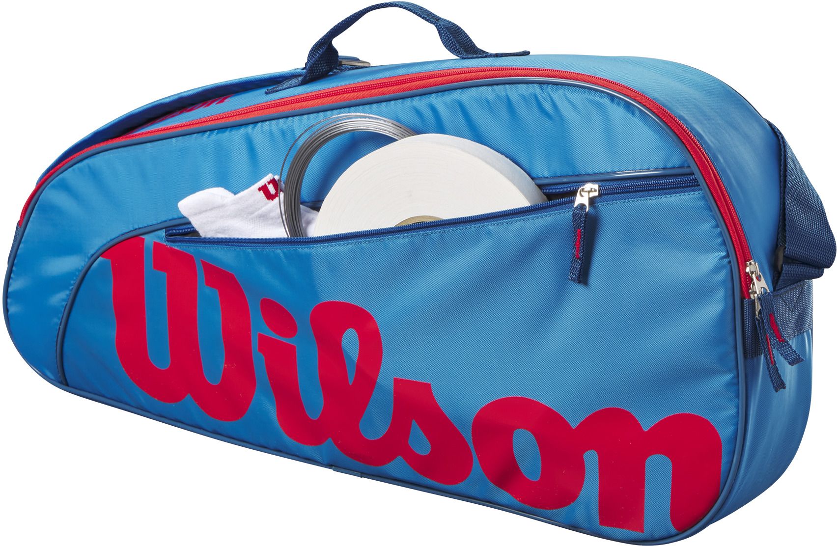 Wilson Junior 3 Pack Tennis Bag is the ideal bag for junior players heading to the court with all the essentials. The main compartment can hold up to three junior racquets, and an accessory pocked can store additional personal belongings. Padded shoulder strap makes it easy and comfortable to carry.
