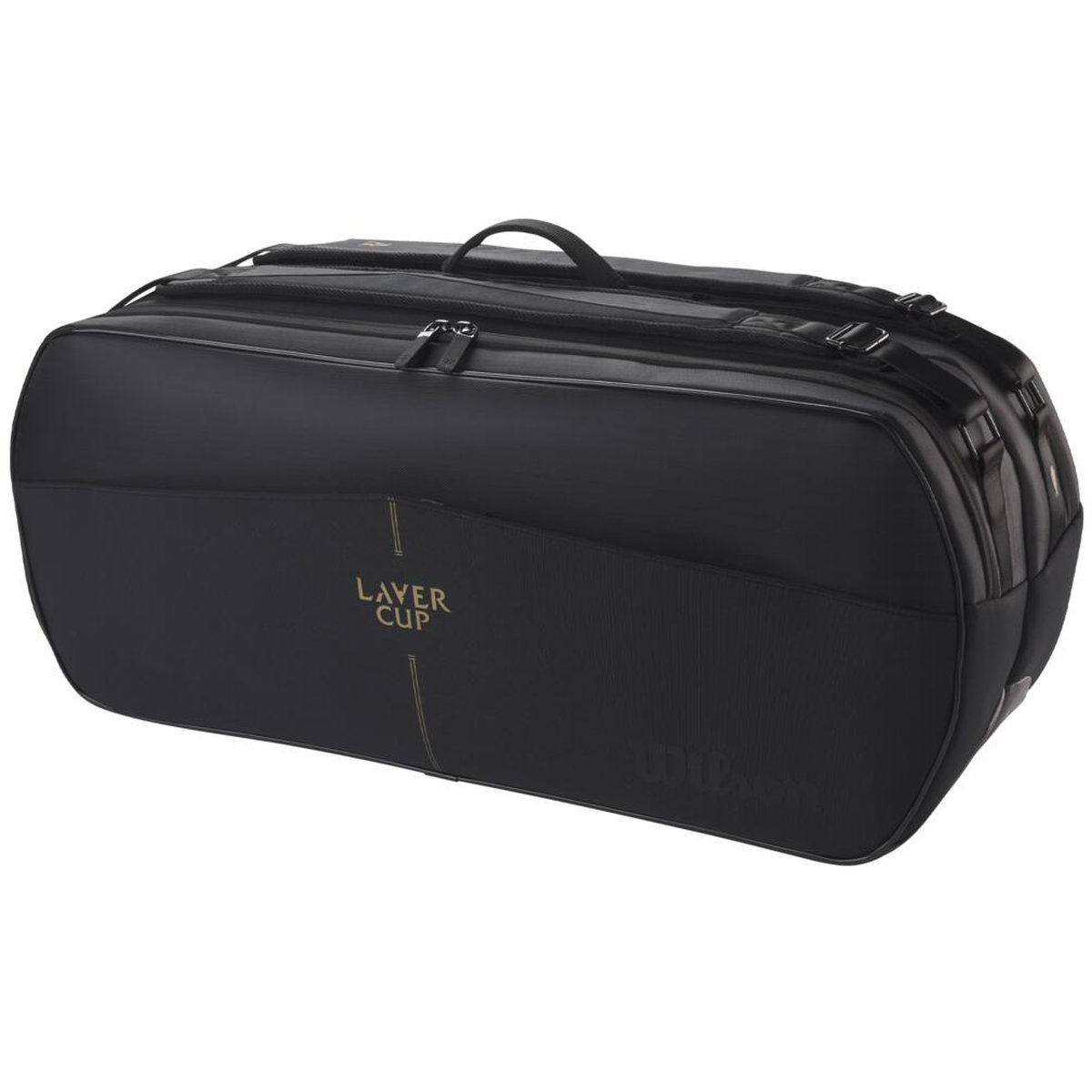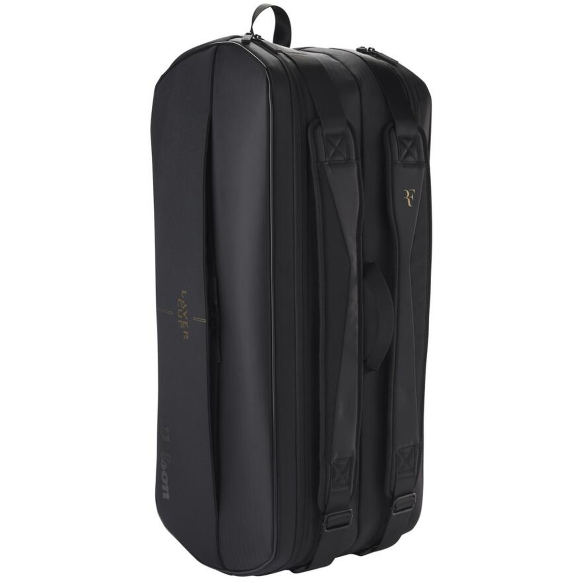 The Wilson RF Tournament Laver Cup 9 Pack Tennis Bag is a tournament-ready bag with room for nine racquets and graced with gold-lettered Roger Federer "RF" and Laver Cup branding.