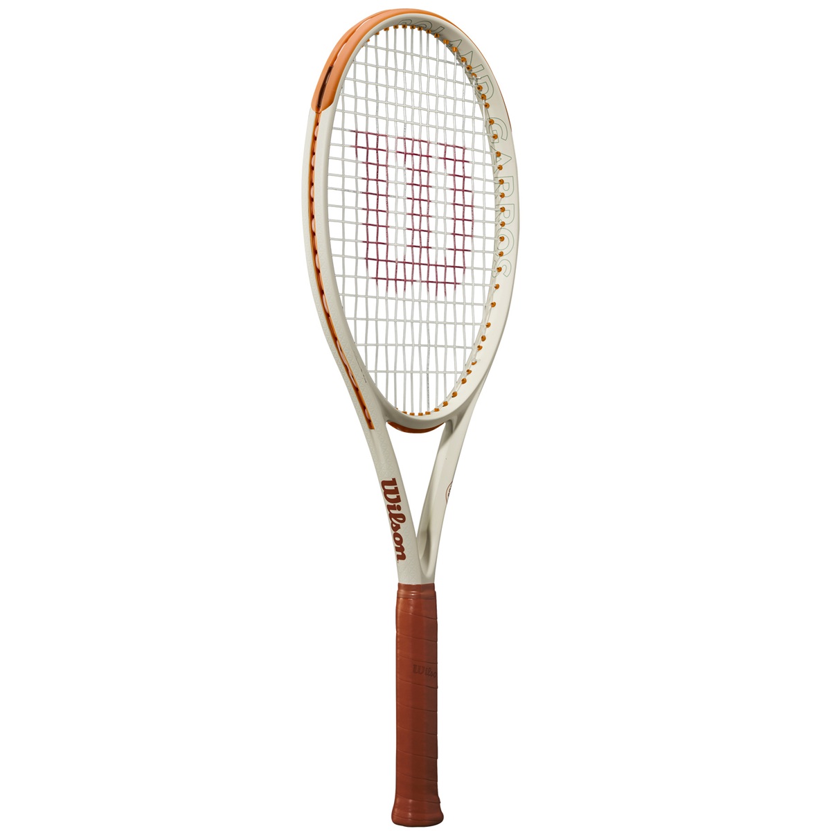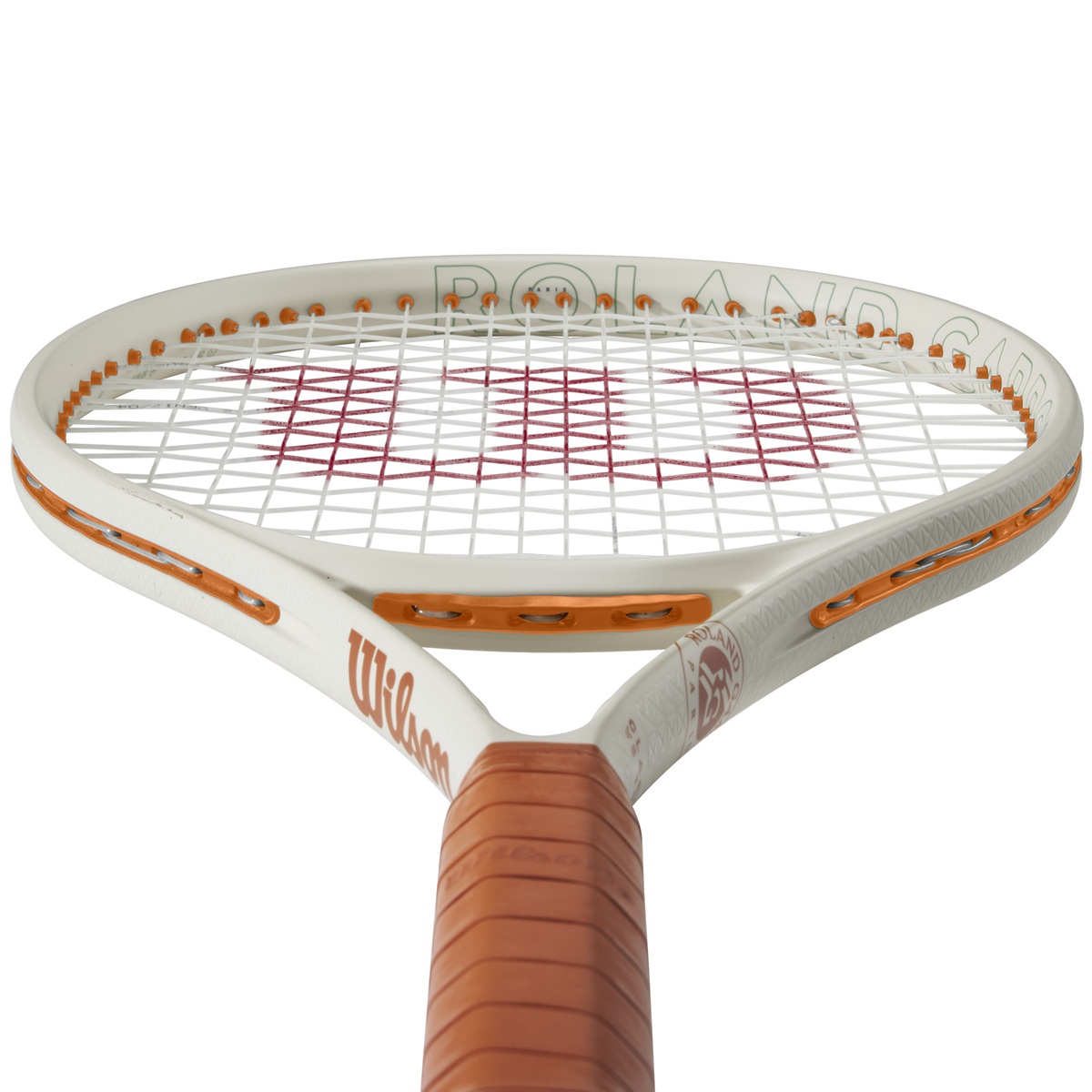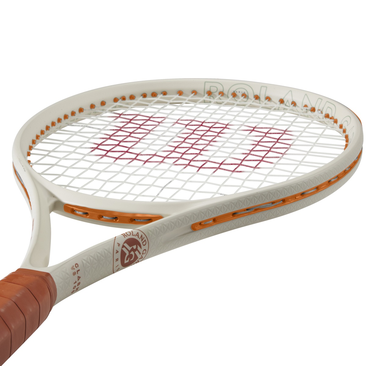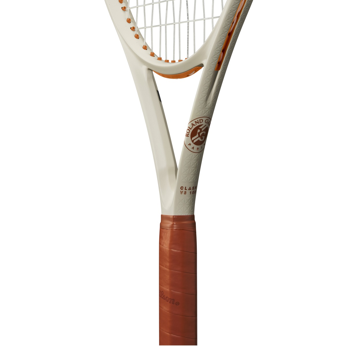 The Wilson Rolland Garros Clash 100 v3 Tennis Racquet includes all the characteristics of the Wilson Clash 100 v3 Tennis Racquet  that retunes the reliable design for power, consistency and control that lets players of all levels play their best tennis. The Roland Garros color scheme of Creme/Clay pays homage to a premier tennis tournament.  Its blend of flexibility, stability and comfort deliver a feeling unlike any other, and its enhanced forgiveness makes everywhere feel like the sweet spot. Agiplast plant-based bumper, grommets and end cap incorporate sustainable components for a reduced environmental footprint, while the new Click & Go bumper system makes replacement quick and easy. The Clash series is designed to let you play harder, rally longer and make the most of every match.