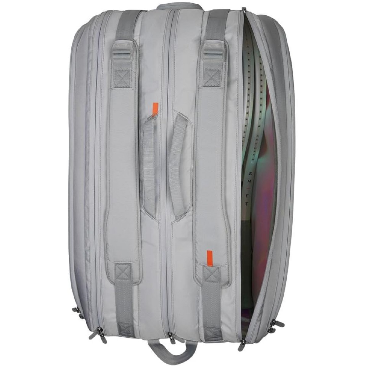 The Wilson Shift Super Tour 15 Pack Tennis Bag (Arctic Ice) is a bag for the high-level tennis player. This Wilson performance bag has the appeal of the new Shift franchise, where the arctic prism design matches the performance racquet. There’s enough space for up to fifteen racquets in the three main compartments, two of which are thermo-regulated to shield from extreme temperatures and preserve racquet tension. You can stash extra gear like balls, grips and accessories inside the large exterior pockets. The bag is reinforced at the sides and comes with Wilson’s dual carrying system.