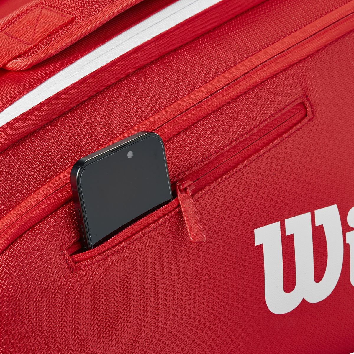 The Wilson Super Tour 9 Pack Tennis Bag (Red/White) is a spacious, pro-level racket bag featuring Wilson’s classic red look.