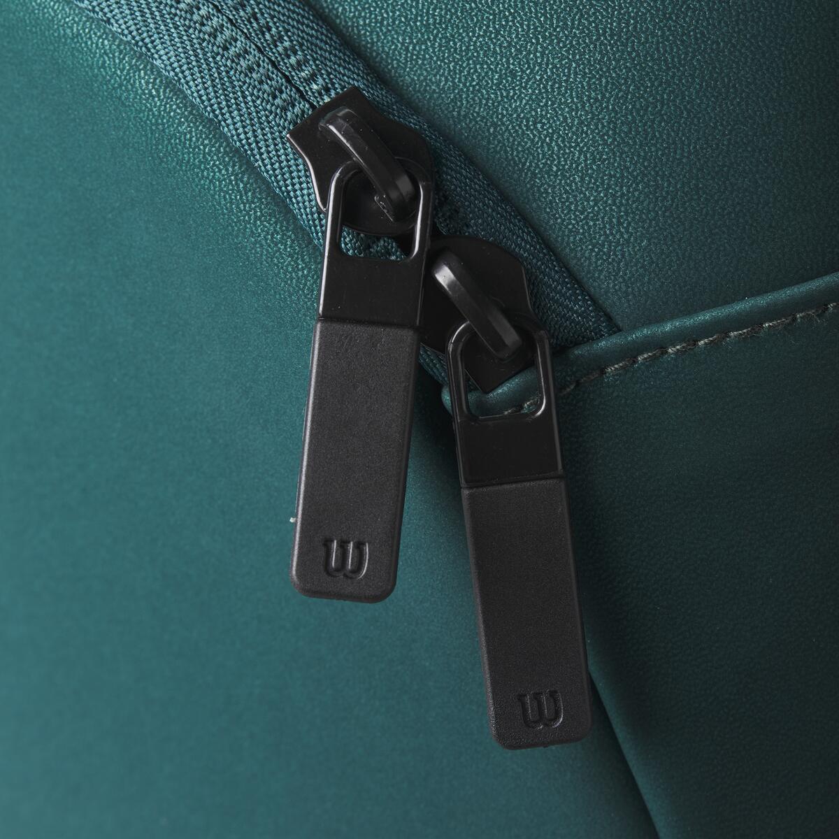 The Wilson Super Tour Blade 15 Pack v9 Tennis Racquet Bag is inspired by the Blade V9's sleek, dynamic racket design and features the same Emerald Green coloring. The ultimate carryall for avid tennis players and coaches alike, this multifunctional racket bag holds up to 15 rackets, equipment, apparel and other essentials. It has three primary compartments, two of which are lined with thermoguard material to protect against changes in temperature. There's a ventilated compartment for shoes and extra pockets on the sides for additional storage. It's equipped with durable carry handles and adjustable shoulder straps for easy toting when traveling to and from tournaments.