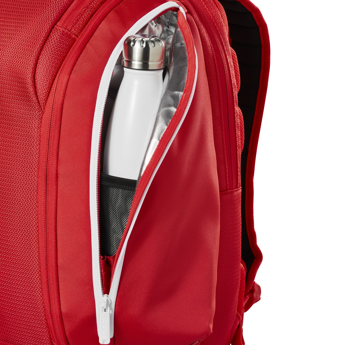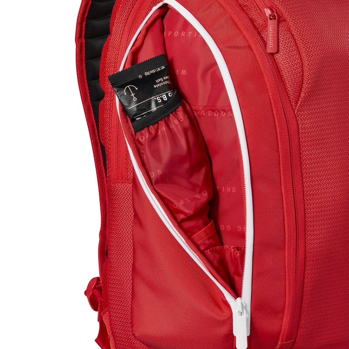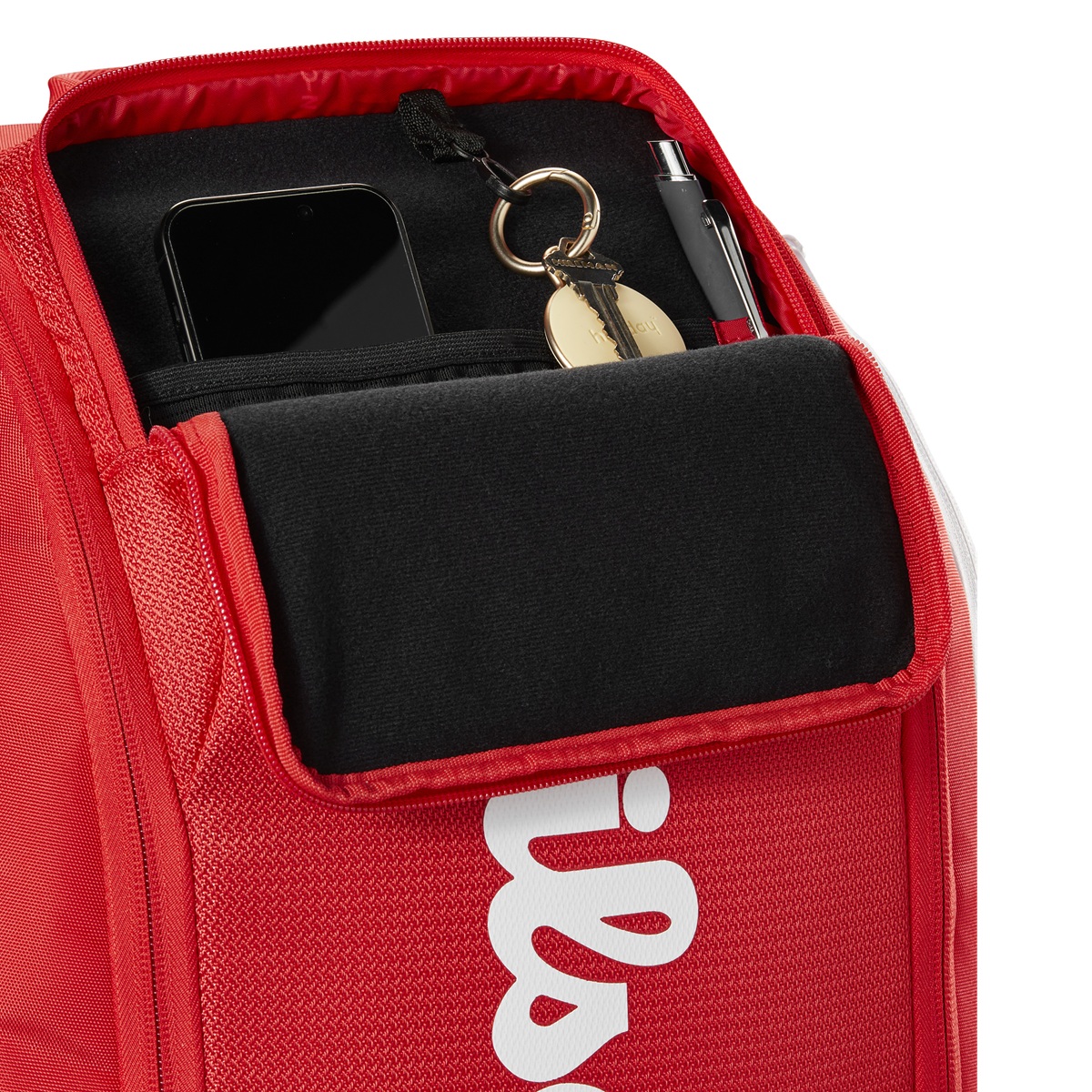 The Wilson Super Tour Tennis Backpack (Red/White) comes with impeccable quality and high-performance expected from the Wilson Super Tour bag collection. Redesigned to be more comfortable and easier to carry, the Super Tour Red backpack functions perfectly as carry-on luggage thanks to an updated travel strap enhanced with new foam and mesh integrated into the back panel and shoulder straps.