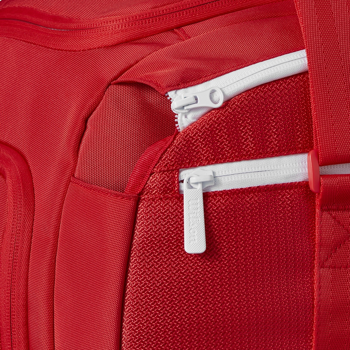 The Wilson Super Tour Tennis Duffle Bag S (Red) is majestic red, Wilson's most iconic color. The Super Tour Duffle bag is ideally suited for avid players who need extra carrying capacity for extra gear and shoes. A perfect tournament travel companion to one of the Super Tour Red racket bags, it's also a great alternative for practice sessions, when players prefer to travel light to the courts. In addition to the dedicated shoe compartment and side pocket for smaller items, the duffle has a new separate compartment designed for a tennis racket. Padded carry handles make it comfortable and easy to haul.