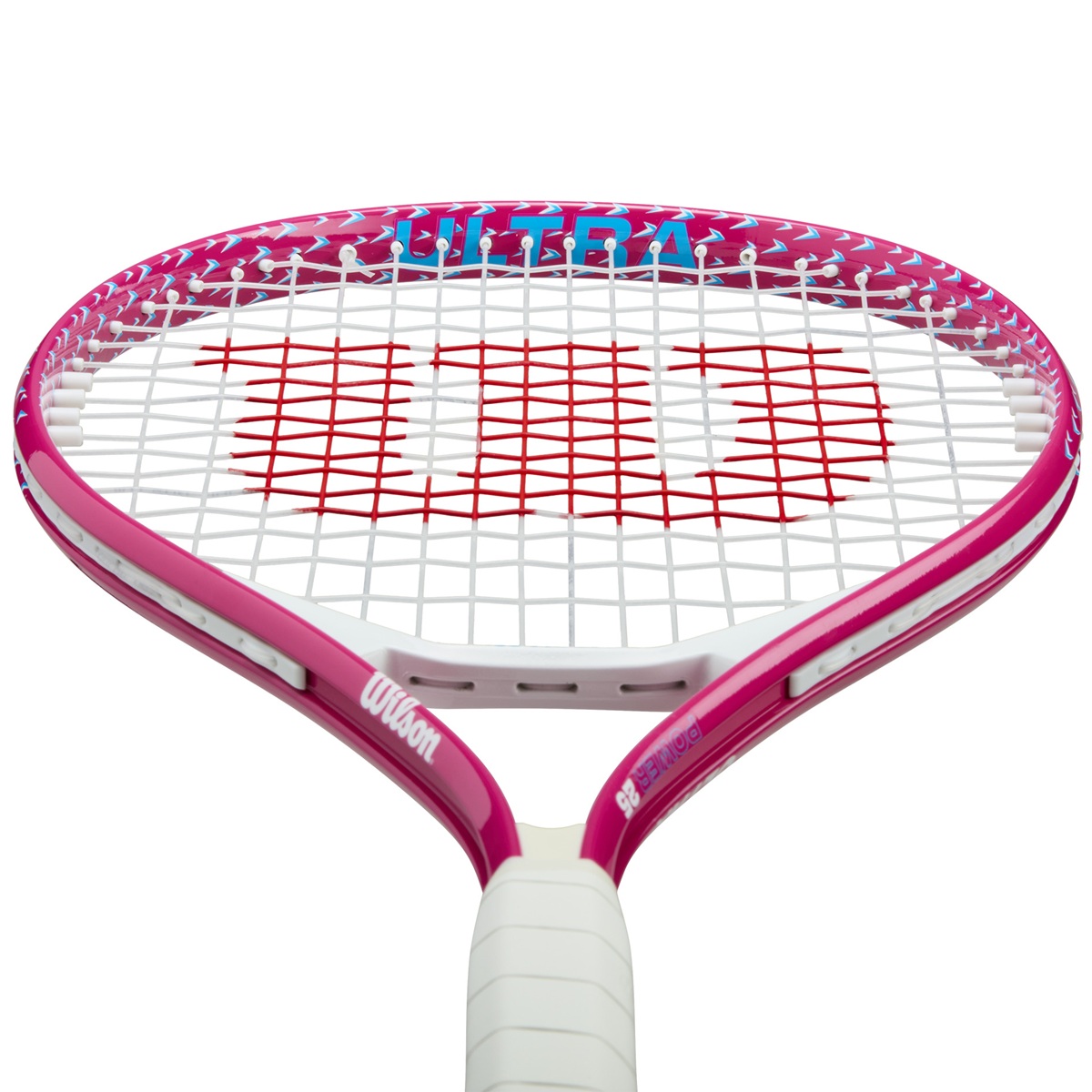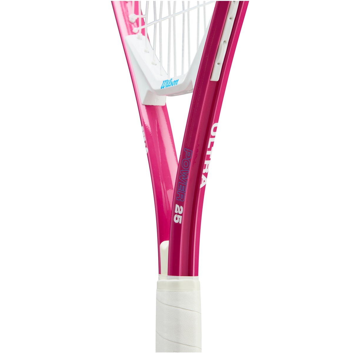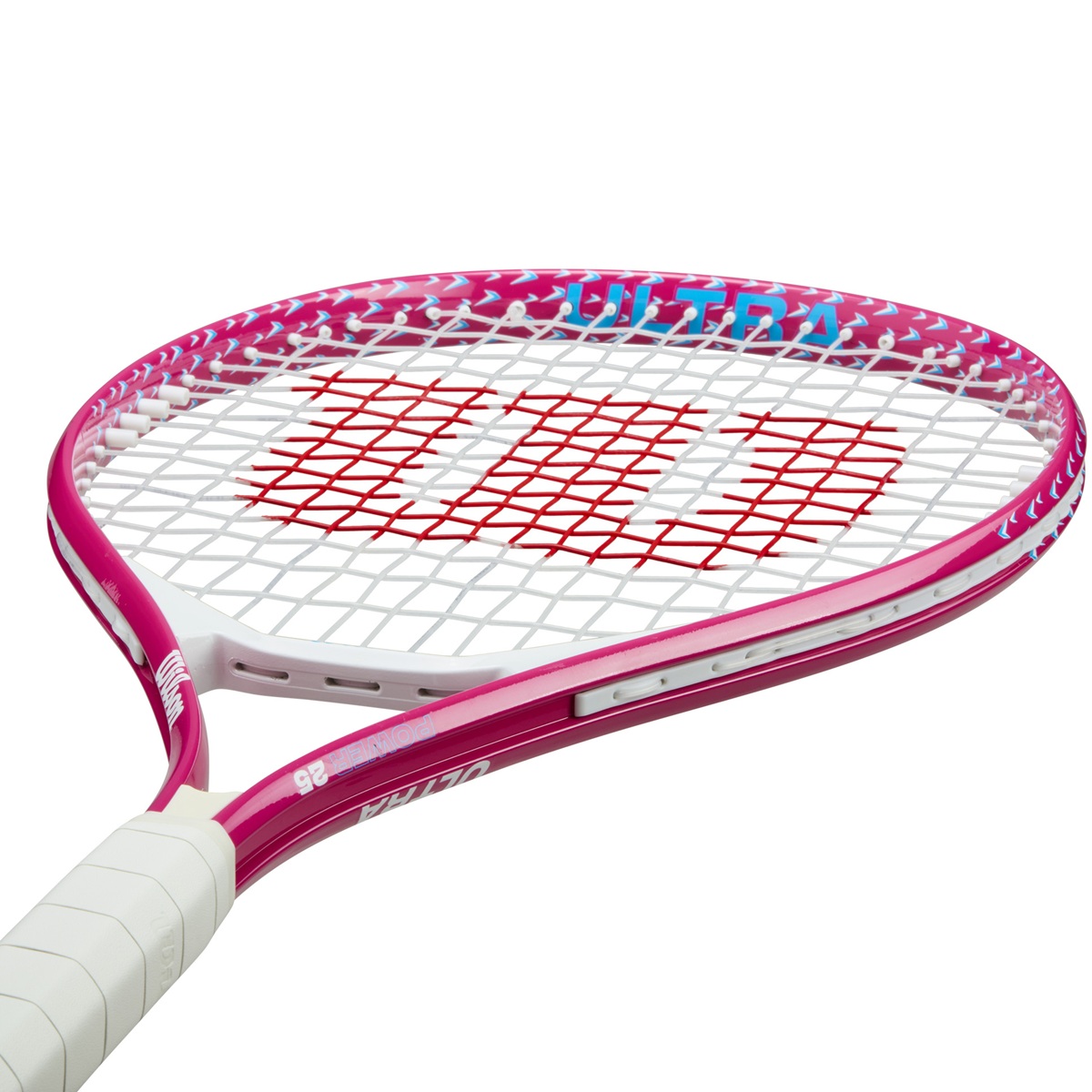 The Wilson Ultra Power 25 Inch Junior Tennis Racquet (Pink) has a flashing a vivid design that is sure to light up the court, this racquet comes pre-strung and equipped with a bumper guard to help minimize damage when the racquet contacts the court surface. Created specifically for younger players aged 9 to 10 years old starting to learn the game, the Ultra Power showcases a fun design while also providing players with everything needed to pick up the sport. Technologies in the frame make it stable, powerful, and easily maneuverable when hitting shots. It also comes pre-strung, so there's no reason not to take your racket wherever you go!