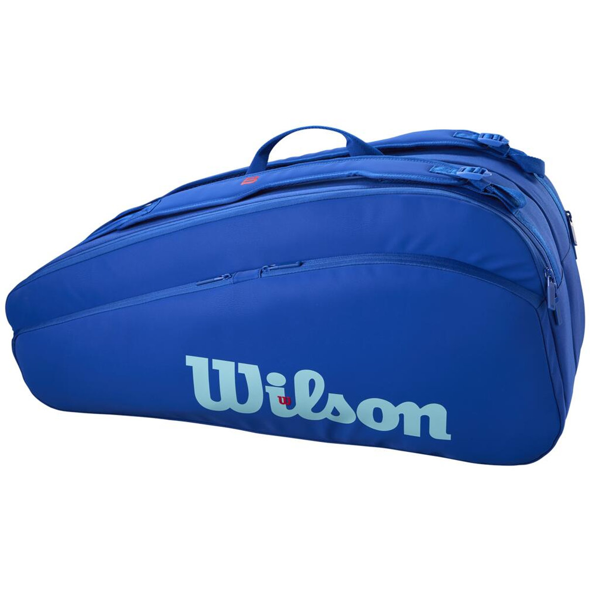The Wilson Ultra v5 Tour 12 Pack Tennis Bag provides tournament-ready functionality with ample room for tennis essentials. Holding up to 12 rackets in two separate zippered compartments, including one with a Thermoguard lining to protect against extreme temperature changes, it's also equipped with four exterior side pockets for small items and valuables. Travel comfortably using either the padded backpack straps or the adjustable, padded shoulder strap. Includes a top webbing loop for hanging. Premium trims like high-end zipper pulls and finish details add to the allure of this beautiful blue bag.