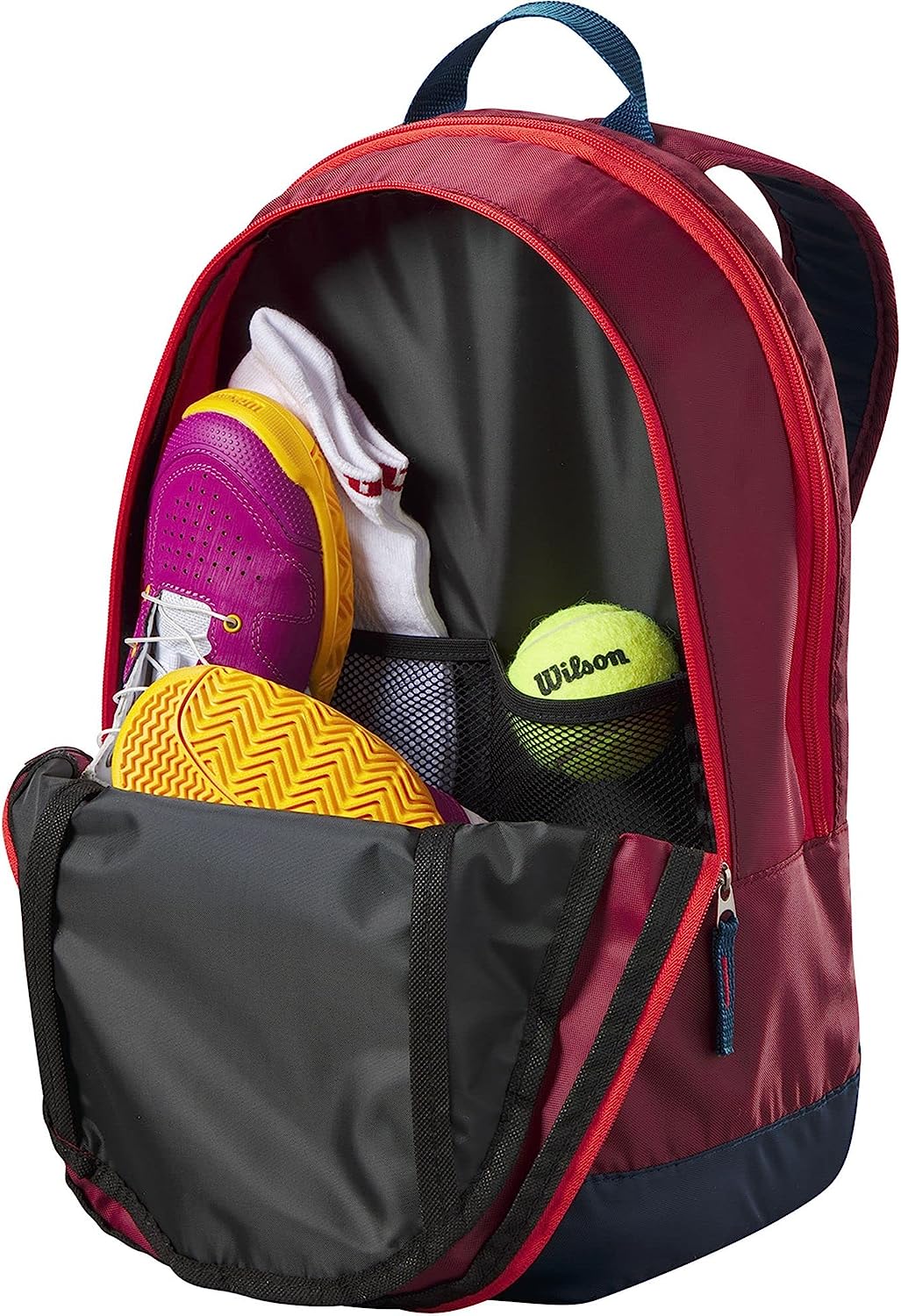 The Wilson Junior Tennis Backpack is the ideal, compact bag that stores anything and everything for junior players heading to the courts. A great option for kids biking or commuting. The Junior Backpack has two main compartments. One that can store up to 2 full sized tennis racquets and another than holds everything else. The padded shoulder straps provide additional comfort en route to the courts and the webbing loop makes it easy to hang it up whenever practice is done.