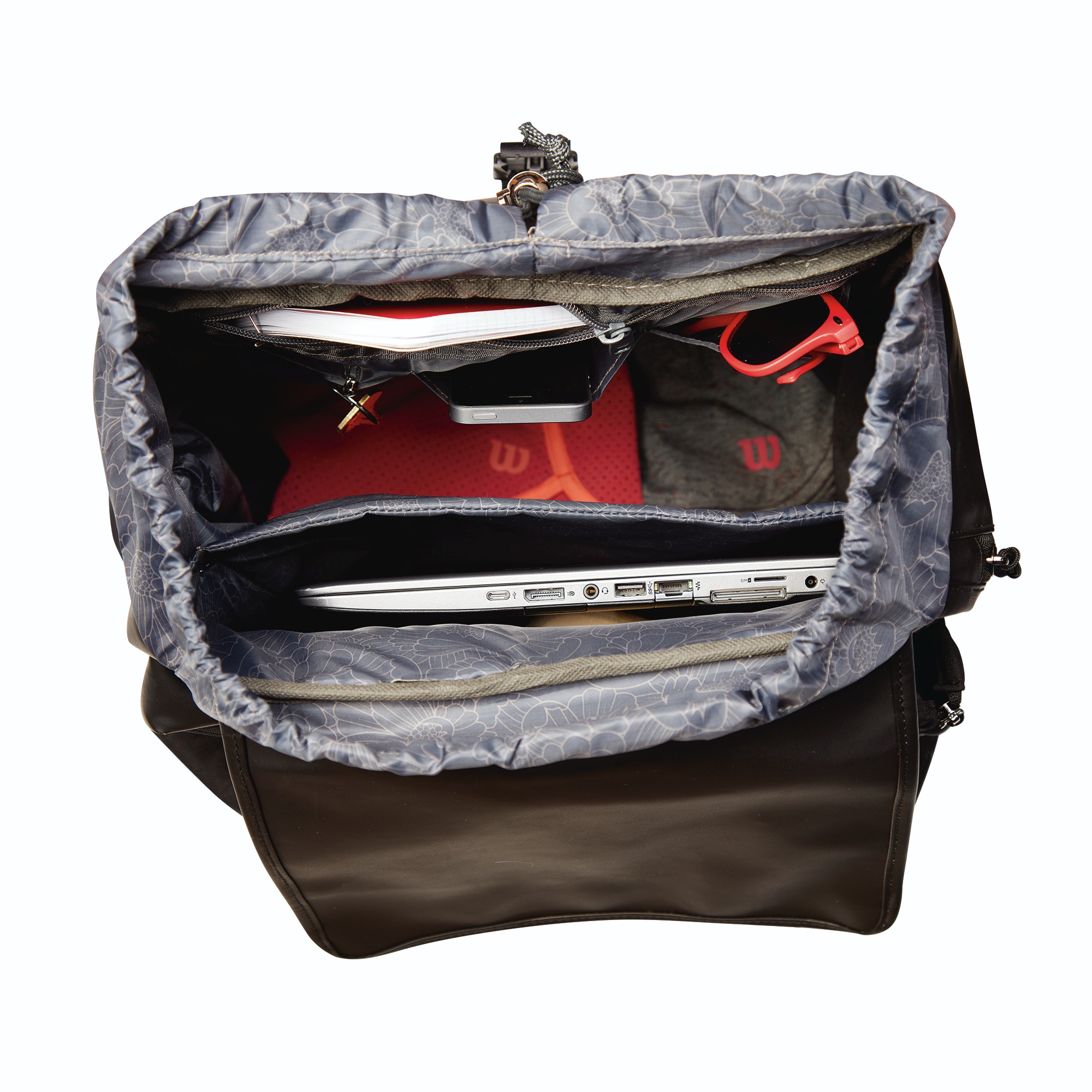Anchored by a laser focus on graphic design free of patterns and unnecessary elements, this premium Wilson women’s fold over tennis backpack packs a plethora of features within its sharp, frosted matte look. Its large main compartment includes a laptop sleeve and a zip pocket for valuables, while a Thermoguard side pocket helps keep water bottles cool. Adjustable backpack straps and a top handle provide alternative carrying methods for optimal comfort.