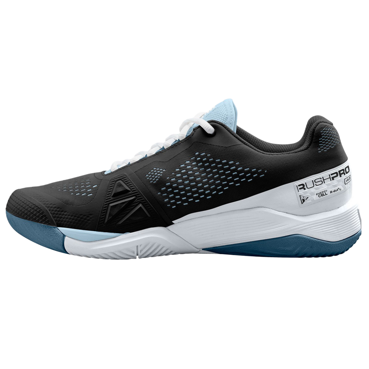 The Wilson Women’s Rush Pro 4.0 Tennis Shoes (Black/White/China Blue) is designed for best performance on all court surfaces.