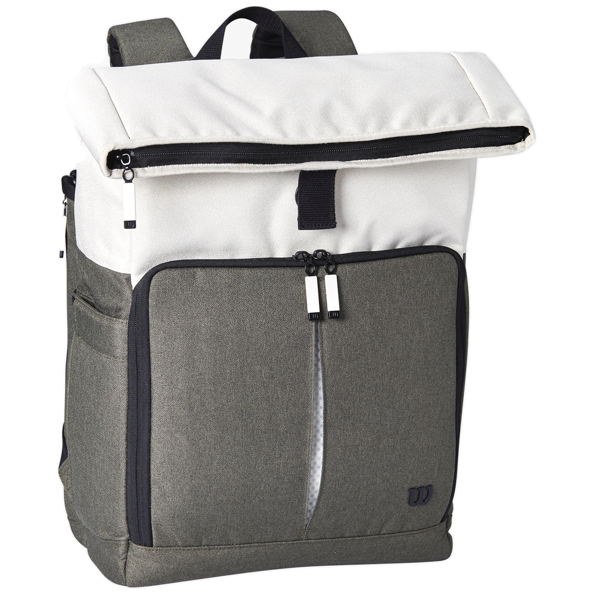 Crafted from 100% recycled PET polyester, the Wilson Women’s Tennis Backpack gives a nod to the environment with a neutral, versatile and sophisticated look. Loaded with useful functionality, this foldover backpack accommodates up to two tennis rackets in a back compartment with locking zippers, a laptop or tablet in an interior sleeve, and a water bottle or can of balls in an expandable side zipper pocket if desired. Additional highlights include a snap enclosure for the folded portion of the backpack, an external zippered accessory pocket and a removable zippered shoe bag for a change of footwear.