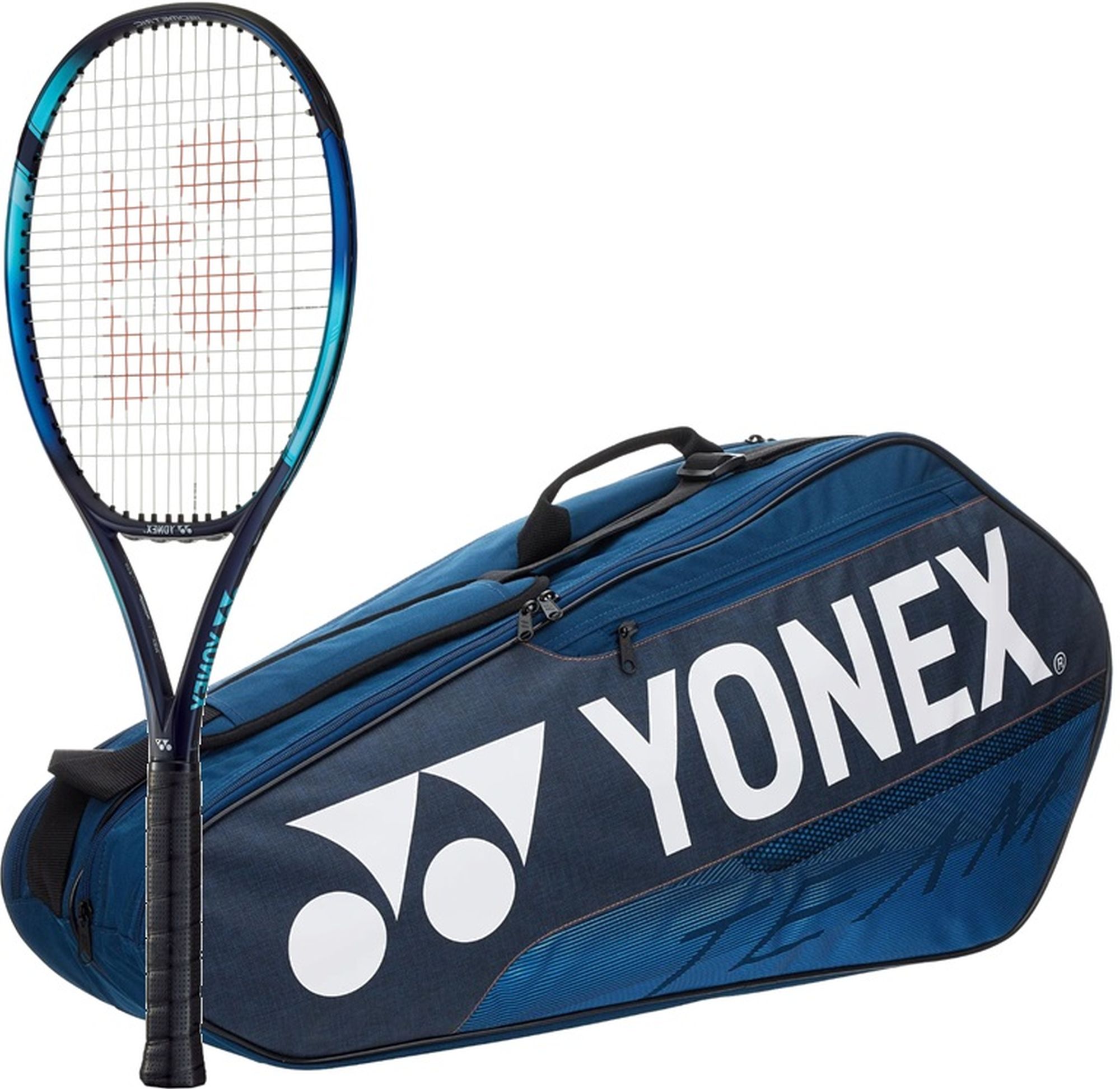 This tennis starter set includes (1) Yonex EZone 98 7th Generation Sky Blue Tennis Racquet in your choice of grip size and (1) Deep Blue Yonex Team 6 Racquet Tennis Bag.