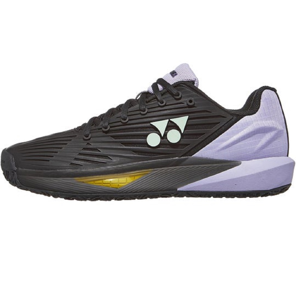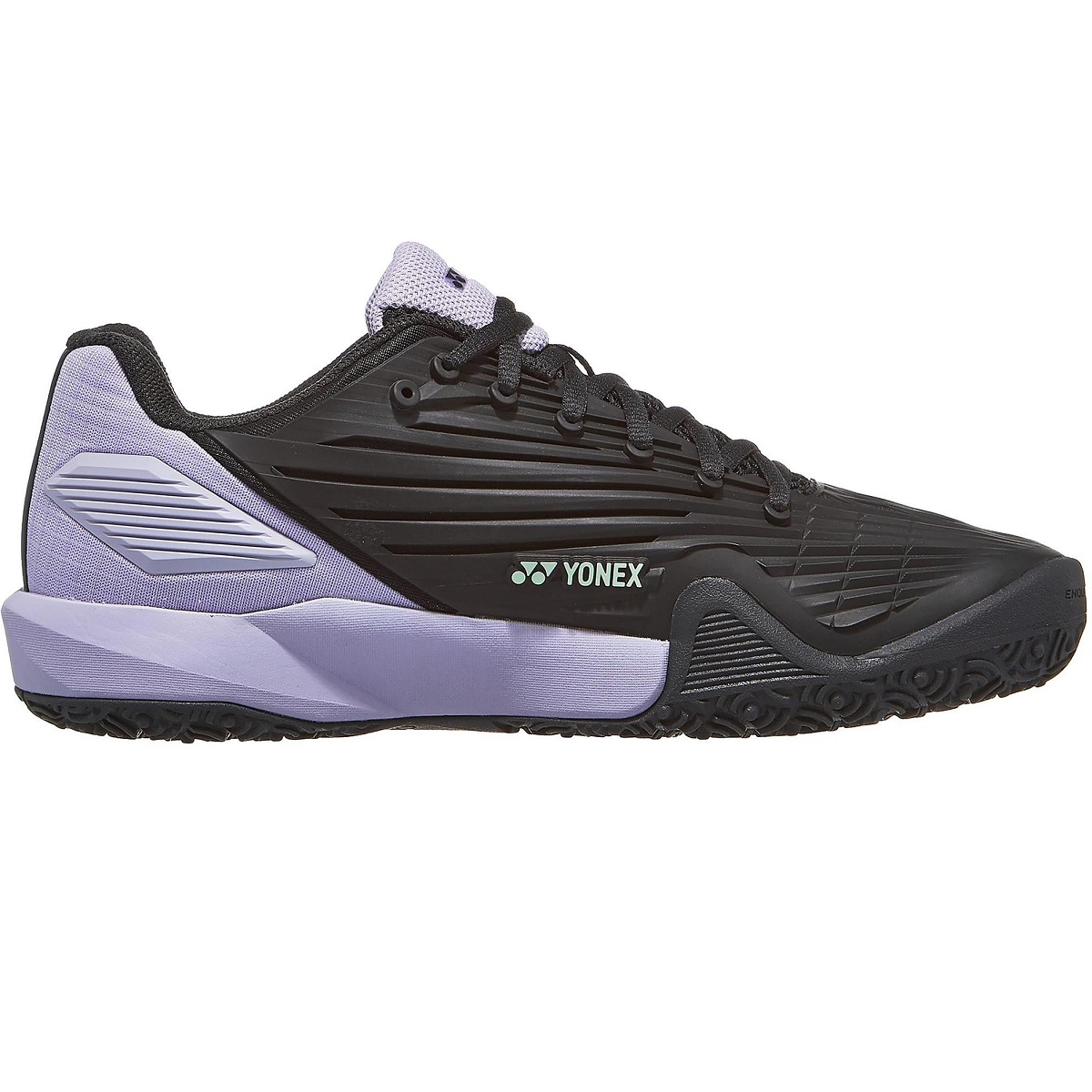 The YYonex Men's Power Cushion Eclipsion 5 Clay Tennis Shoes (Black/Purple) are part of the ECLIPSION 5 series of new tennis shoes for intermediate and advanced players. This footwear was developed to provide superior support for a player’s intense and dynamic footwork during play, including sudden stops and changes in direction that are core to playing tennis. With enhanced stability and fit, the ECLIPSION 5 tennis shoes are designed to help players feel more confident on the court. This Clay Court version has the signature shock-absorbing material from Yonex that has been transformed into a new shape that improves shock absorption by 28%, providing extra support on the outer side of the foot. Additionally, POWER CUSHION+ has been integrated with thermoplastic polyurethane (TPU; a resilient material that exhibits both elasticity and plastic-like durability) in the outsole area, which provides increased court gripping and quickens spring back power by 5%. This enables players to quickly change their directions and finetune their movements on the tennis court for better control over their next movement.