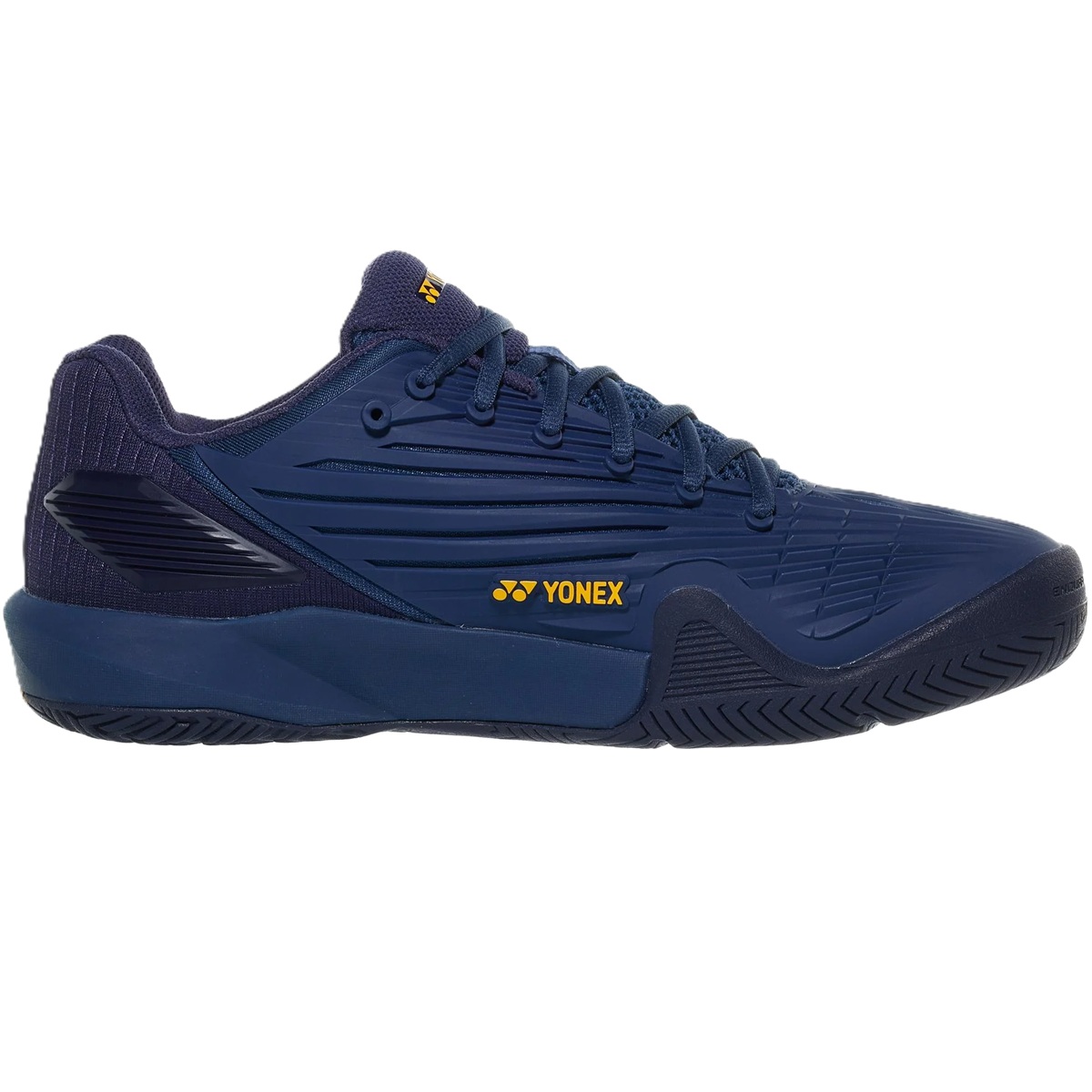 The Yonex Men’s Power Cushion Eclipsion 5 Tennis Shoes feature a denser sole pattern for improved foot stability and control during movements.