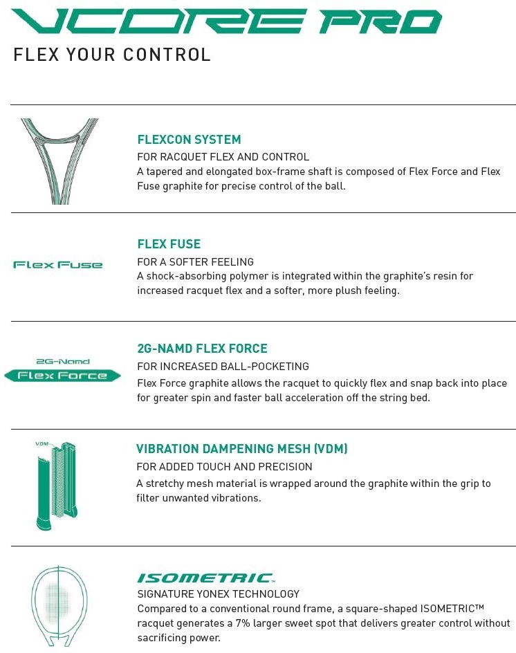 The new Yonex VCORE PRO 97H (330g) Tennis Racquet focuses on precision and control. With 36% more racquet flex, the 3rd-generation VCORE PRO was developed for players looking to gain control over all aspects of ball movement: from the ball’s trajectory, speed, spin and bounce, to ball placement.