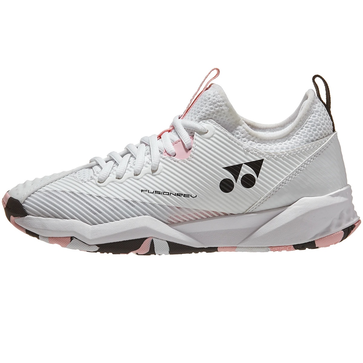The Yonex Women’s FusionRev 4 Tennis Shoes (White/Pink) are a refresh of the FusionRev. The Yonex Women’s FusionRev 4 Tennis Shoe remains the perfect shoe for players looking for the ideal blend of support, cushioning & speed. Like version 3, Yonex designed the Women’s FusionRev 4 Tennis Shoe with a bootie construction upper with the “Fusion Wing” that locks your foot in on the court. Yonex continues the use of “Power Cushion +” in the midsole for an even smoother ride out on the court. Yonex reconstructed the outsole with an Endurance Rubber compound in a zonal tread pattern which helps with durability. Yonex pull-tab on the tongue.